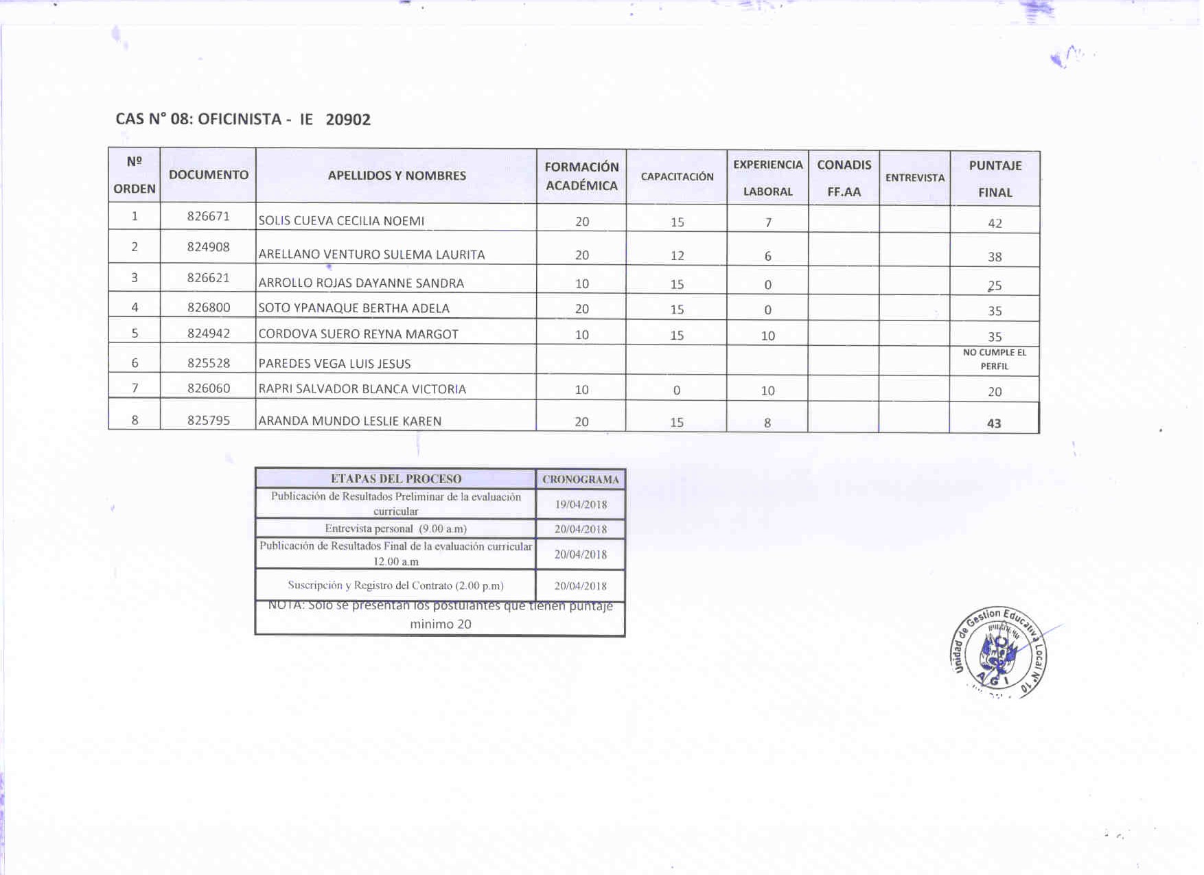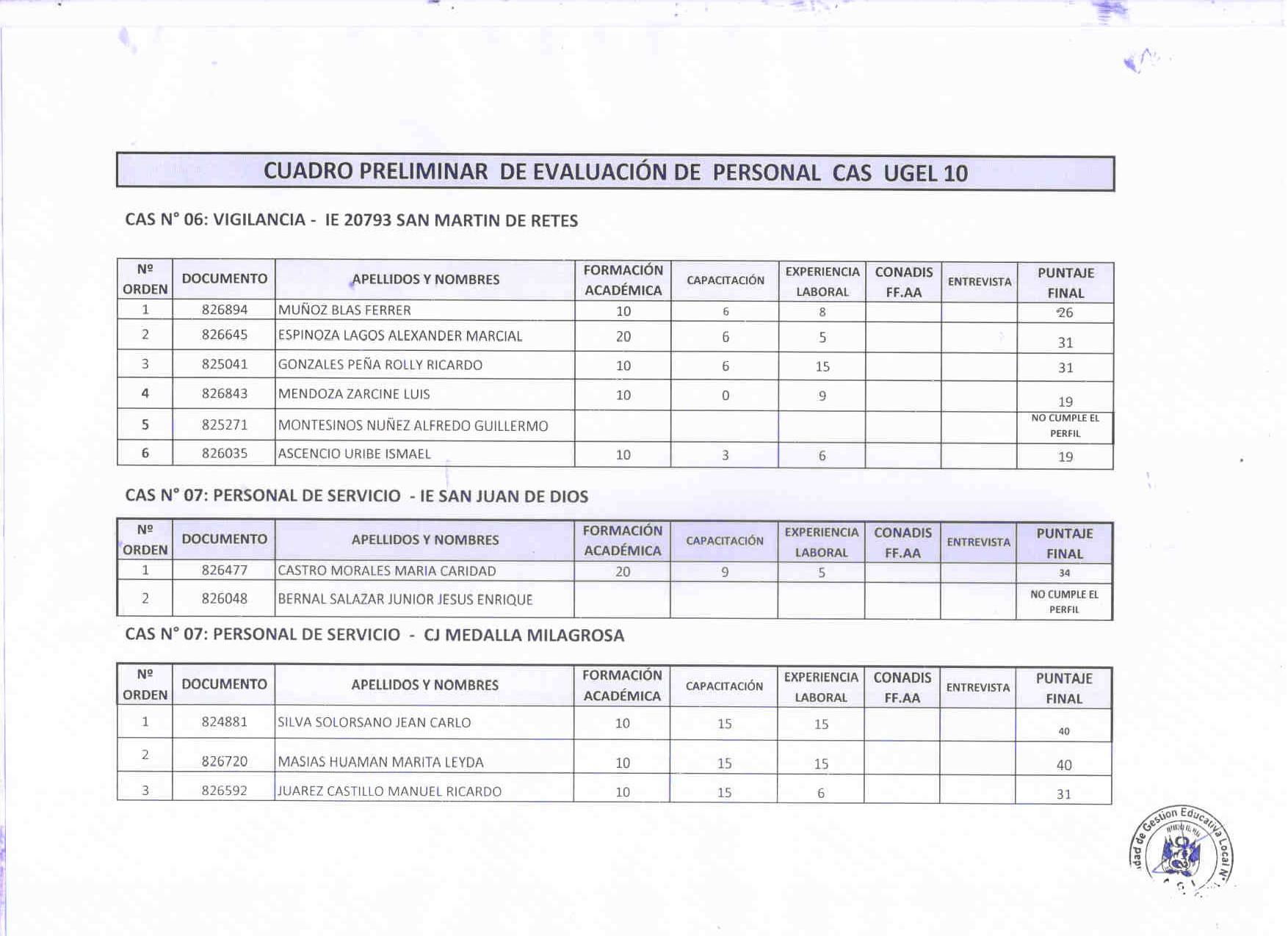 19 Abr,2018 Comunicados COMMENTS Cuadro Preliminar CAS 6, 7, 8 - Vigilancia, personal de servicio, oficinista