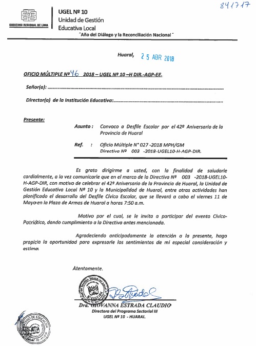 25 Abr,2018 Comunicados COMMENTS Convoco a desfile escolar 42 aniversario Huaral (Ver directiva) VER DIRECTIVA 033-2018 - DESFILE ANIVERSARIO HUARAL