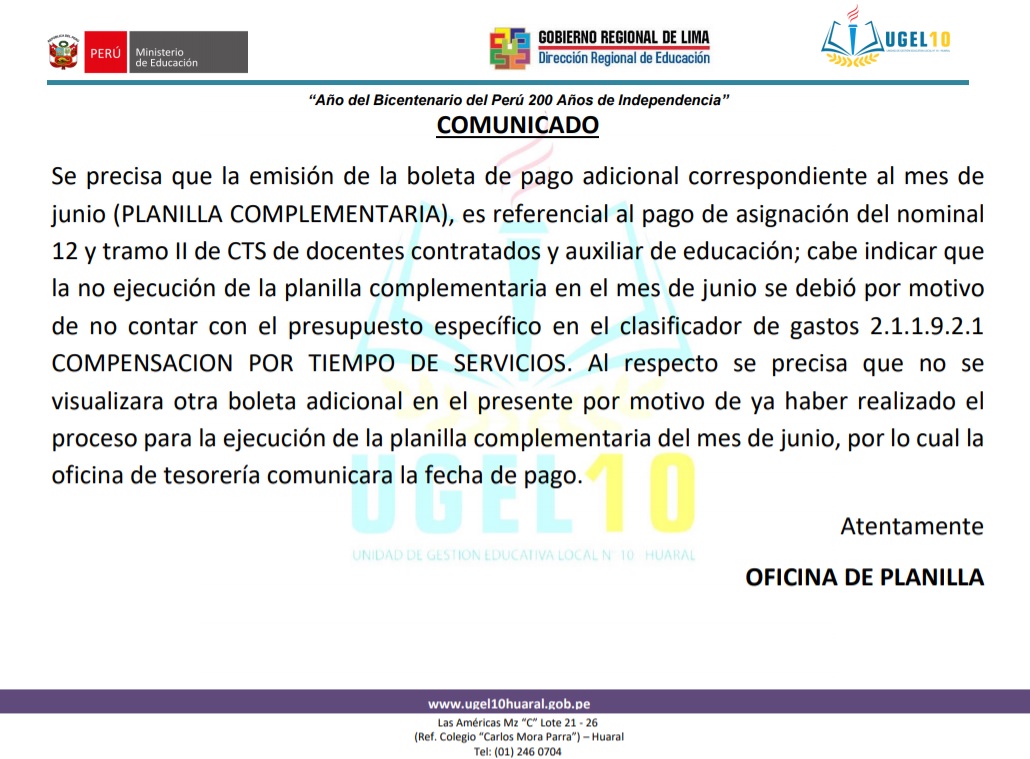 Horarios de atención UGEL N°10: Lunes a Viernes de 08:30 a.m. - 12:30 p.m. y de 14:00 p.m. - 16:30 p.m.