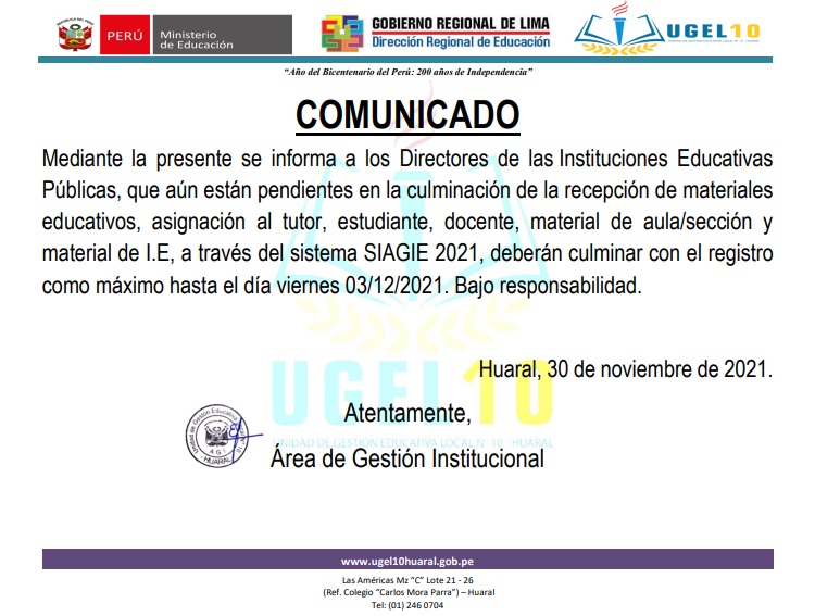 Horarios de atención UGEL N°10: Lunes a Viernes de 08:30 a.m. - 12:30 p.m. y de 14:00 p.m. - 16:30 p.m.