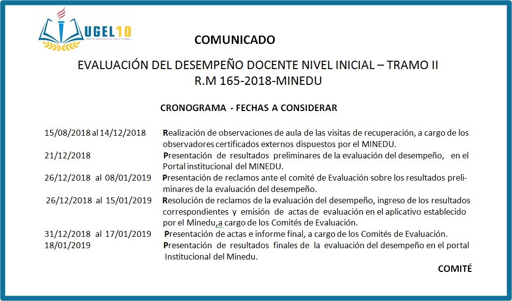 06 Dic,2018 Comunicados COMMENTS Cronograma de Evaluación de Desempeño Docente Nivel Inicial - Tramo II