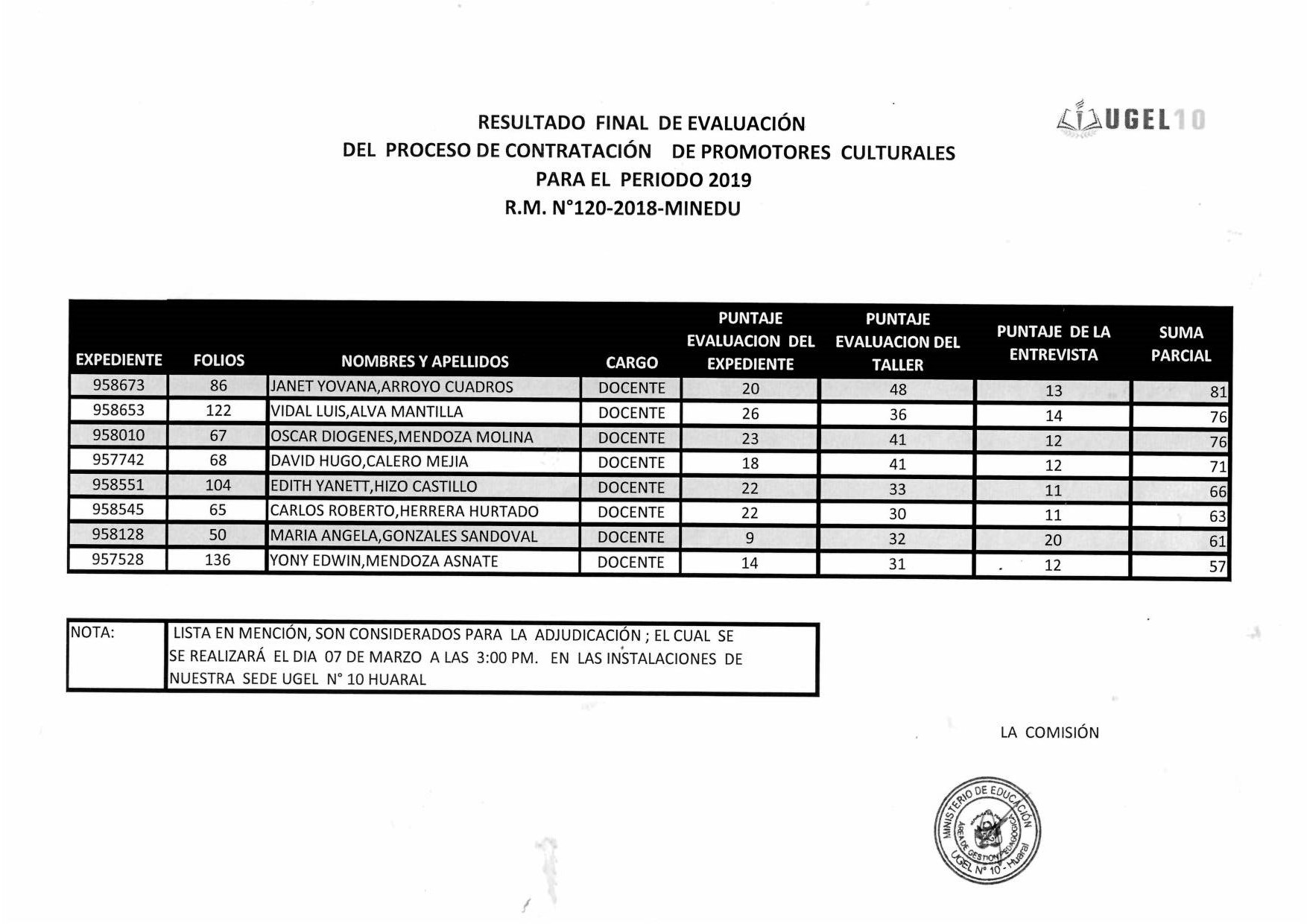 06 Mar,2019 Convocatorias COMMENTS Resultado Final de Evaluación del Proceso de Contratación de Promotores Culturales para el Periodo 2019.