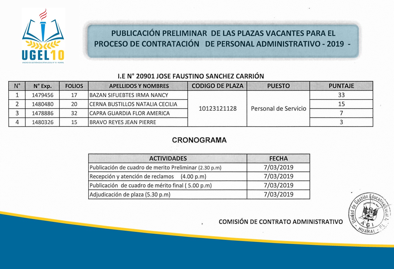 07 Mar,2019 Convocatorias COMMENTS Publicación Preliminar del Proceso de Contratación de Personal Administrativo en I.E