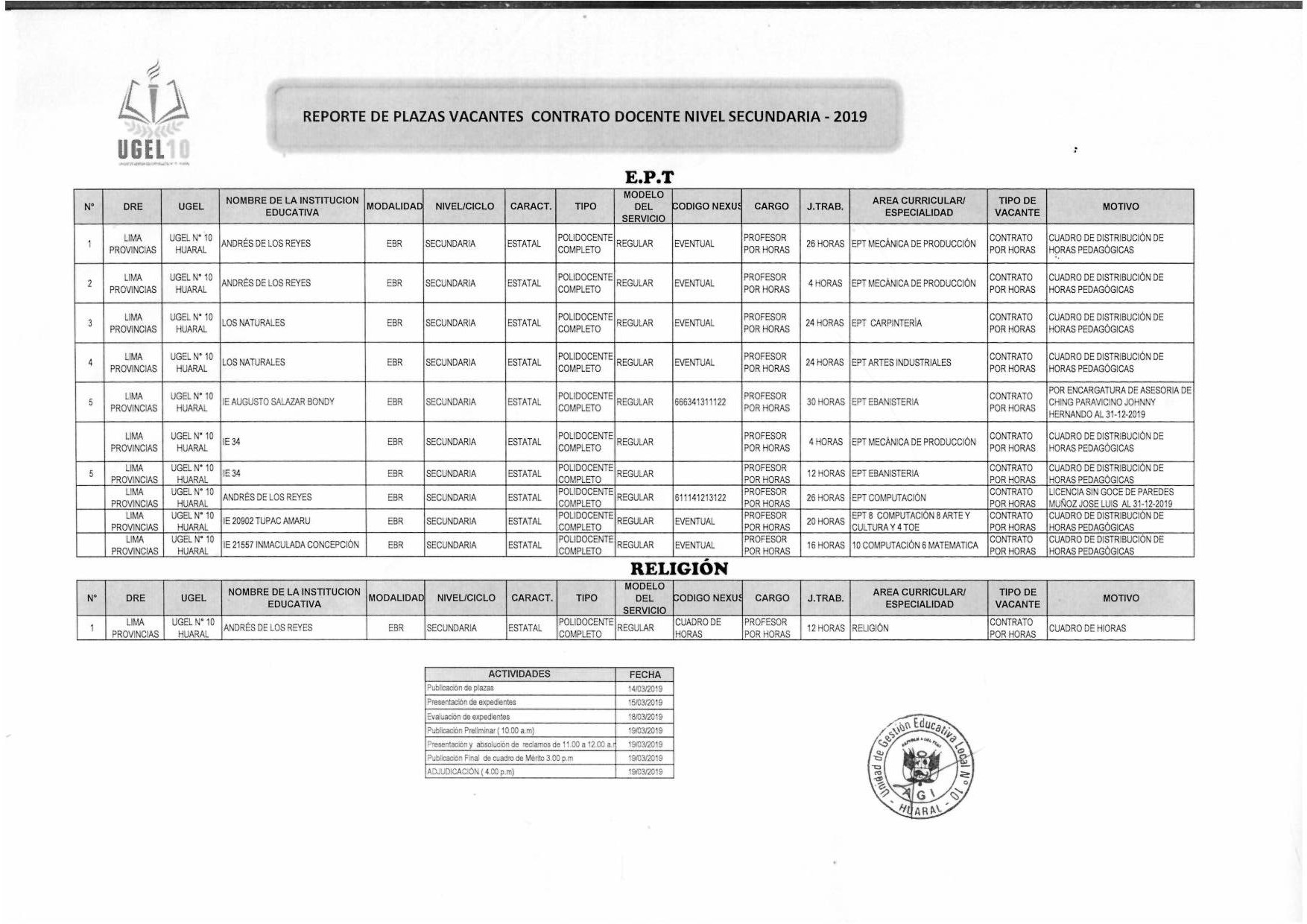14 Mar,2019 Convocatorias COMMENTS Reporte de Plazas Vacantes Contrato Docente 2019 Secundaria (EPT-Relgión) - CETPRO