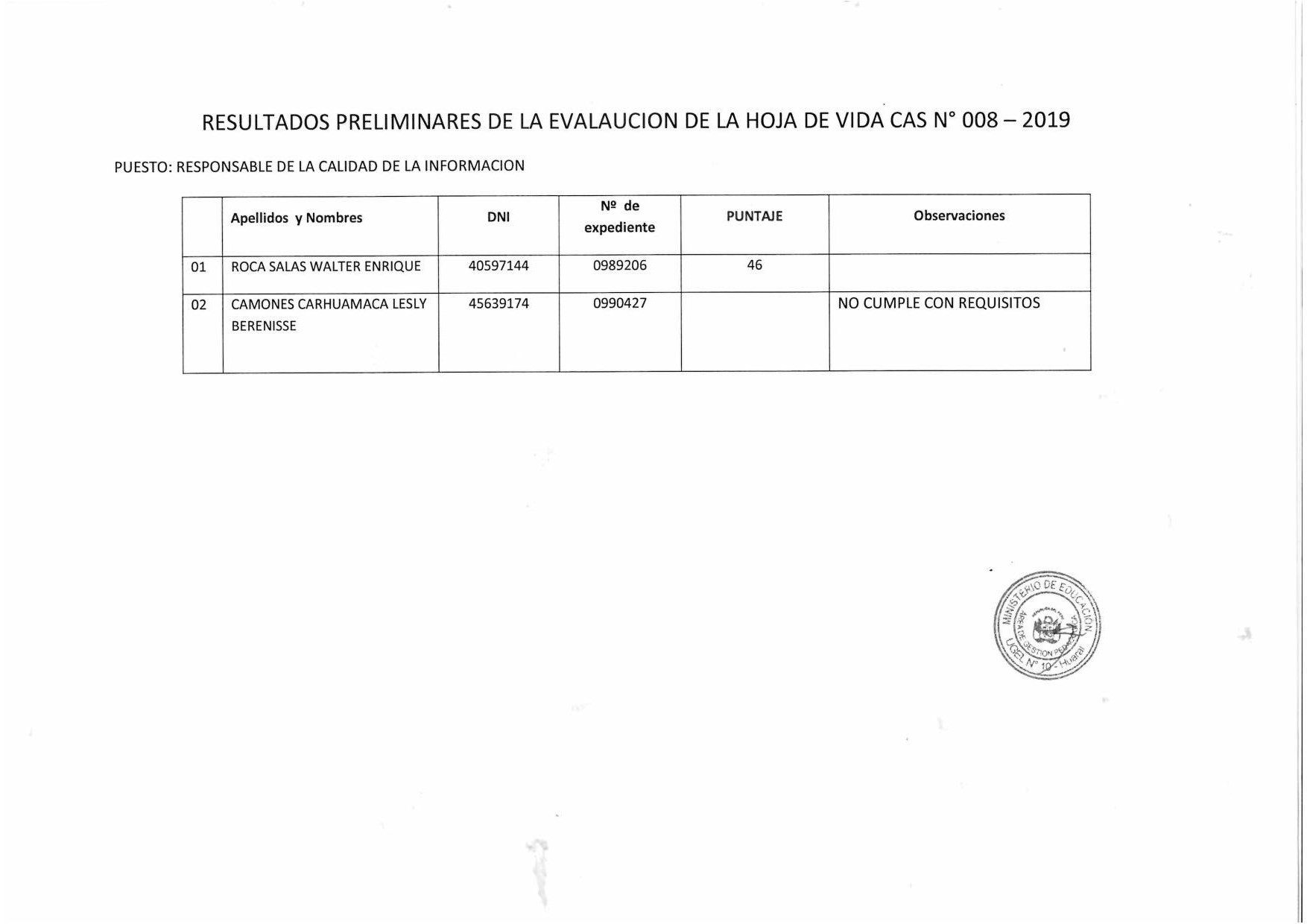 14 Mar,2019 Convocatorias COMMENTS CAS 08 - Resultados Preliminares de la Evaluación de la Hoja de Vida.