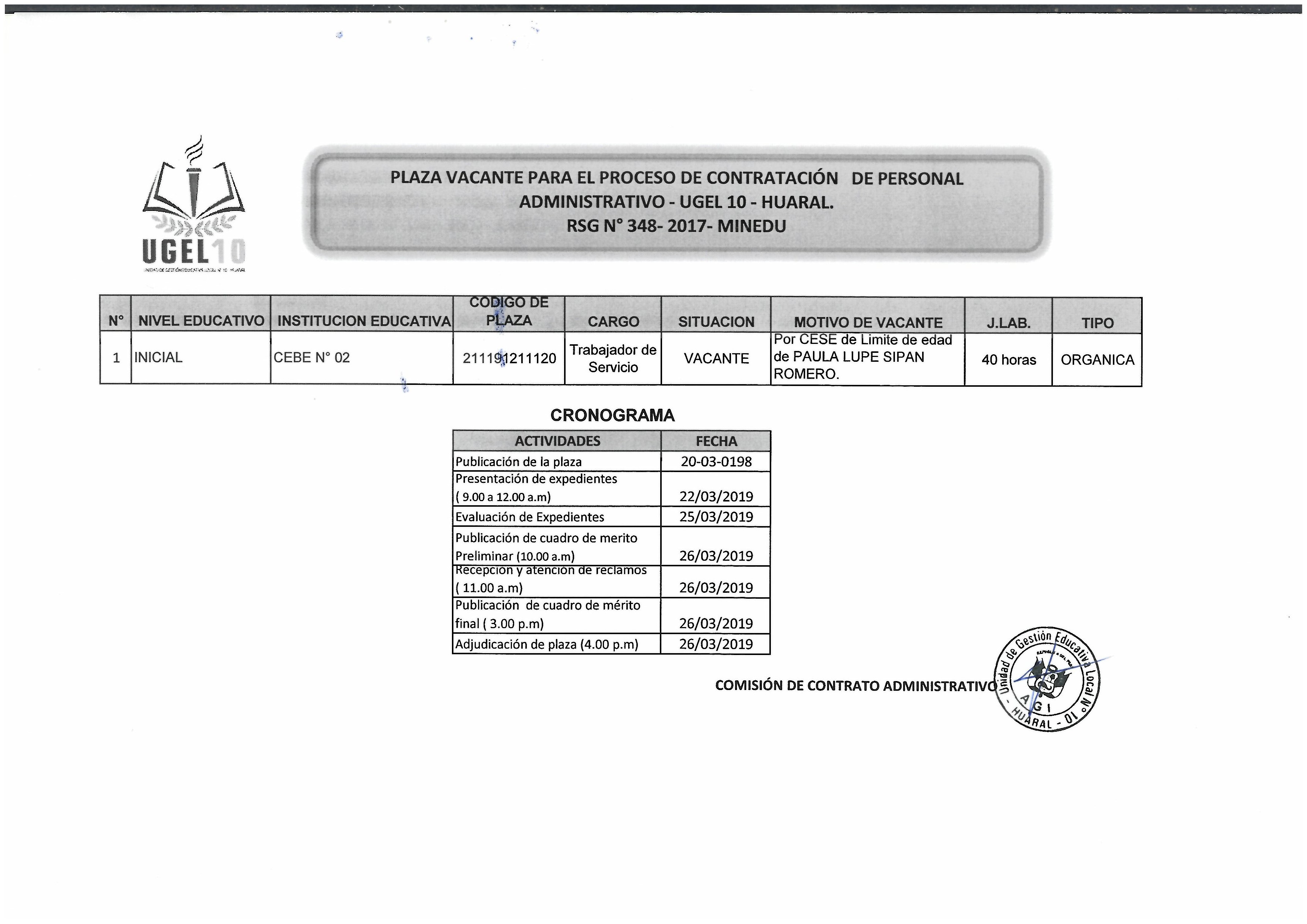 20 Mar,2019 Convocatorias COMMENTS Plaza Vacante para el proceso de Personal Administrativo en CEBE 02