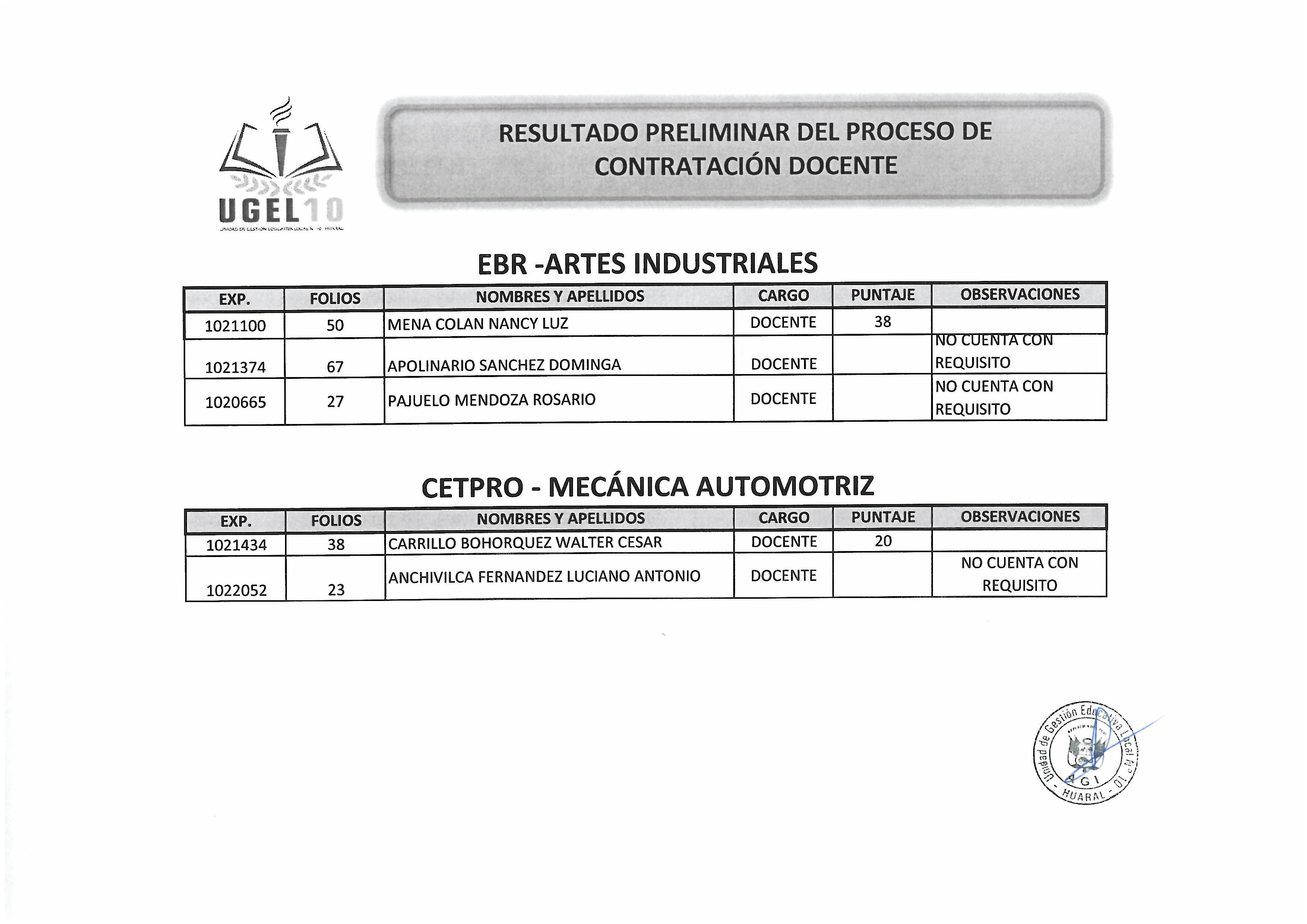 04 Abr,2019 Convocatorias COMMENTS RESULTADO PRELIMINAR DEL PROCESO DE CONTRATACIÓN DOCENTE EBR- CETPRO