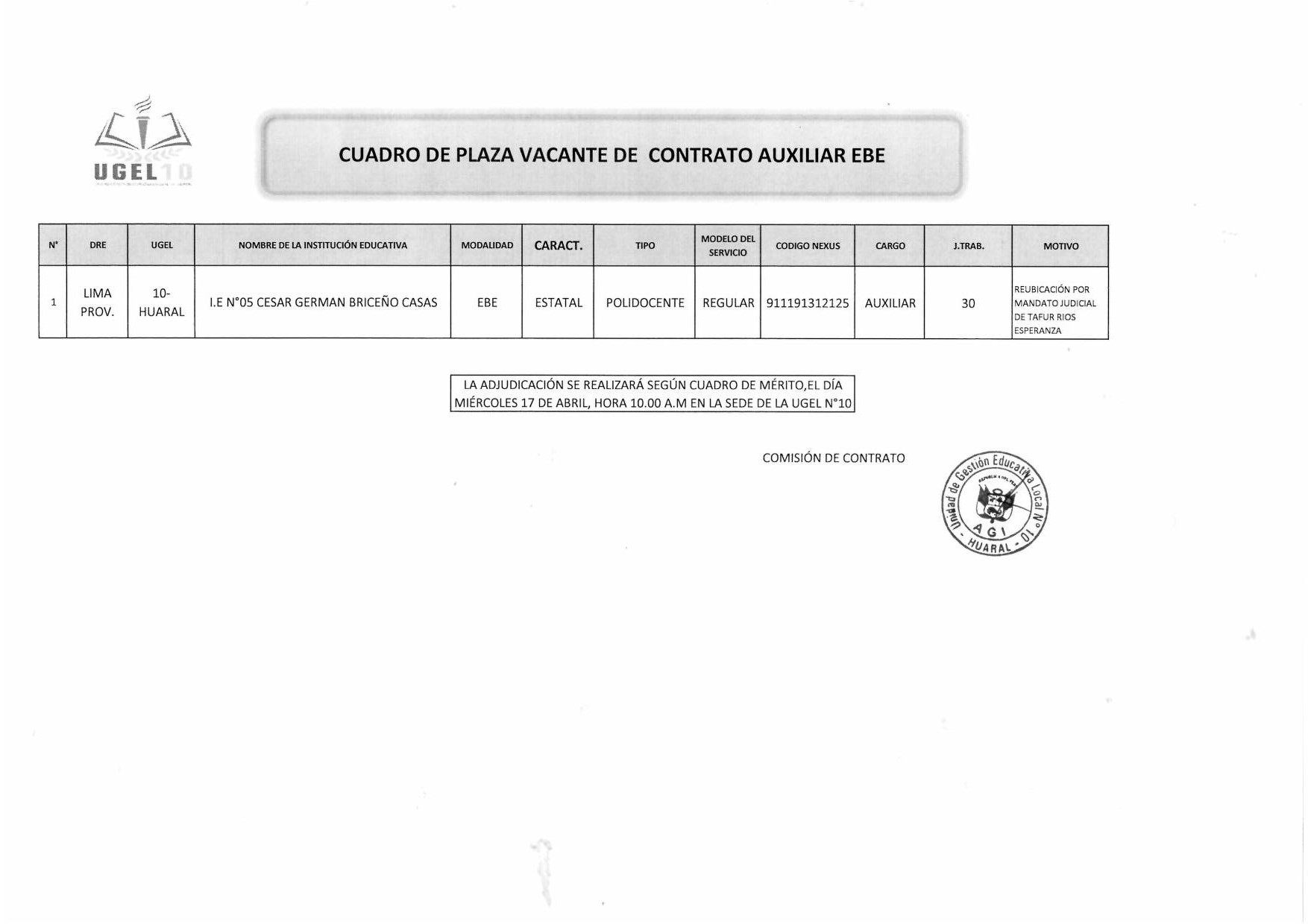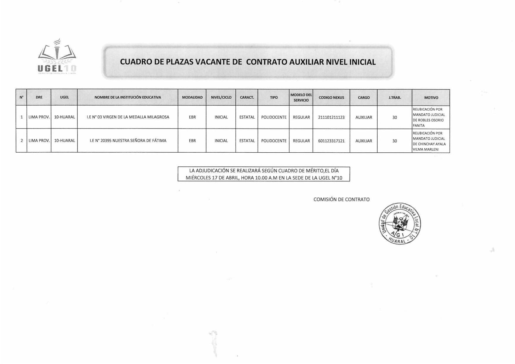 16 Abr,2019 Convocatorias COMMENTS Plazas Vacantes de Contrato Auxiliar según Cuadro de Mérito [Inicial-EBE-Secundaria]