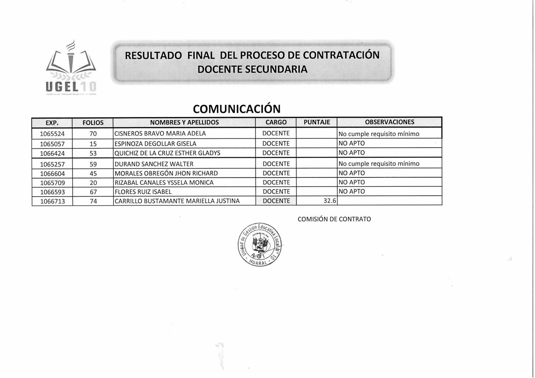 09 May,2019 Convocatorias COMMENTS Resultado Final del Proceso de Contratación Docente Secundaria [comunicación]