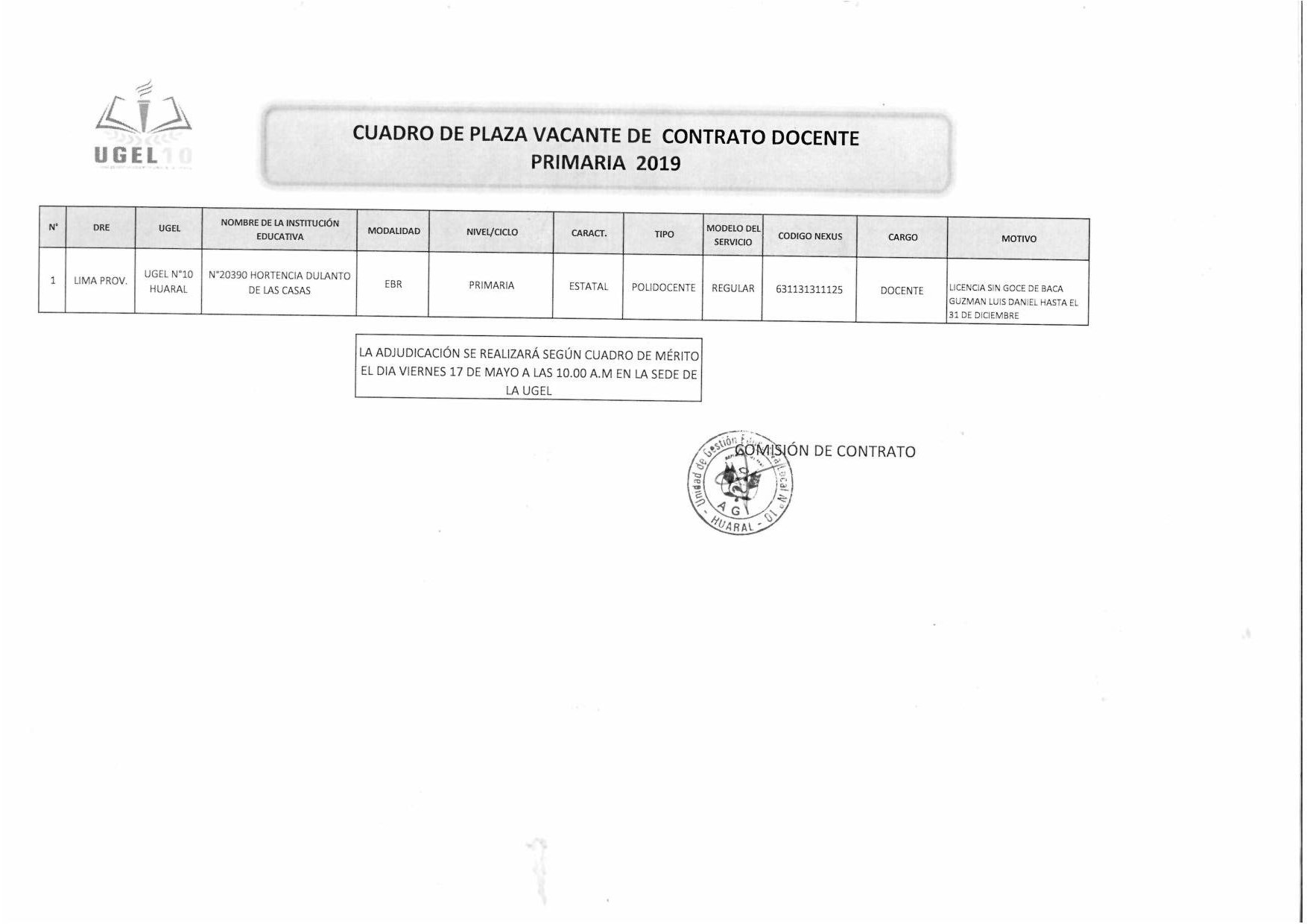 16 May,2019 Convocatorias COMMENTS Plaza Vacante de Contrato Docente Primaria según Cuadro de Mérito.