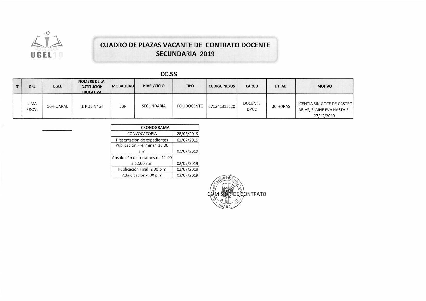28 Jun,2019 Convocatorias COMMENTS CUADRO DE PLAZAS VACANTE DE CONTRATO DOCENTE SECUNDARIA 2019- CC.SS