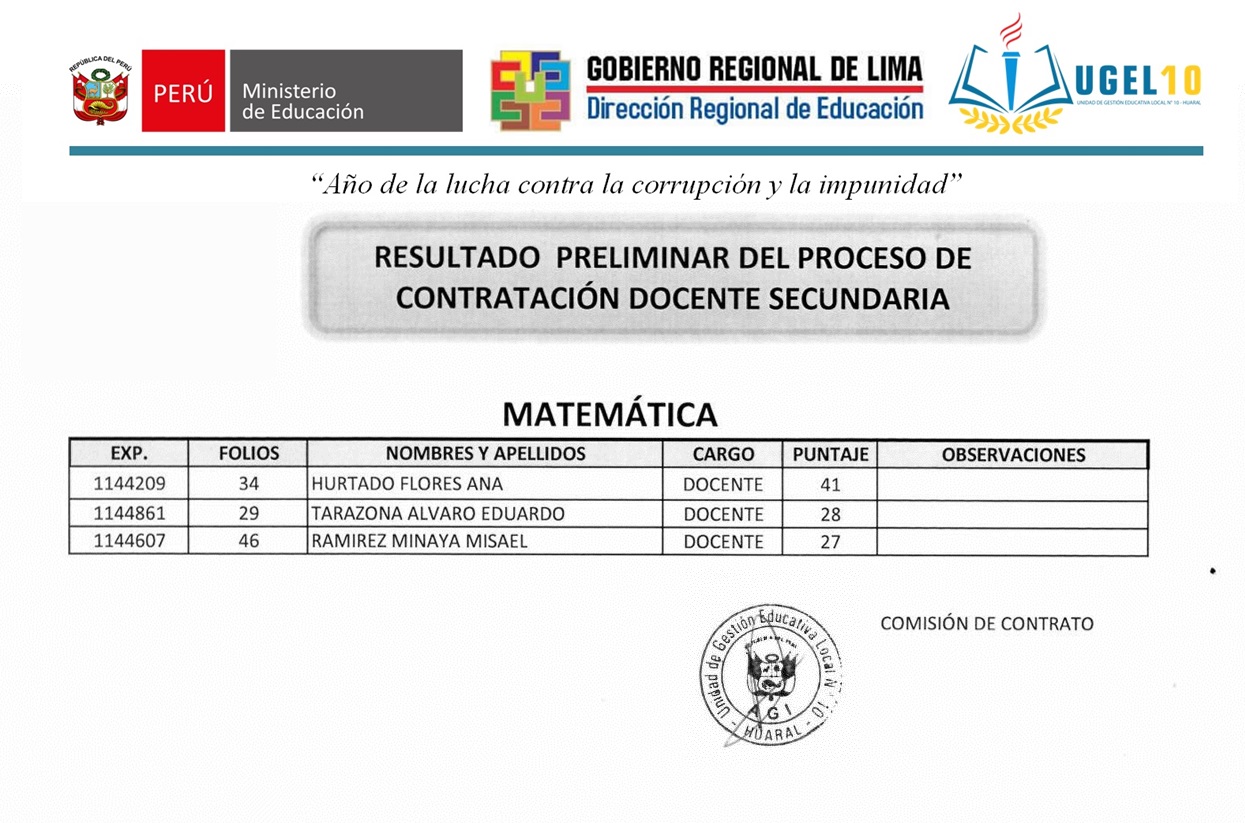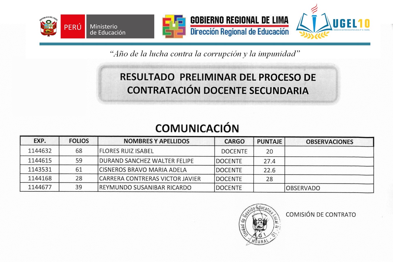 08 Jul,2019 Convocatorias COMMENTS Resultado Preliminar del Proceso de Contratación Docente Secundaria [Comunicación - Matemática]