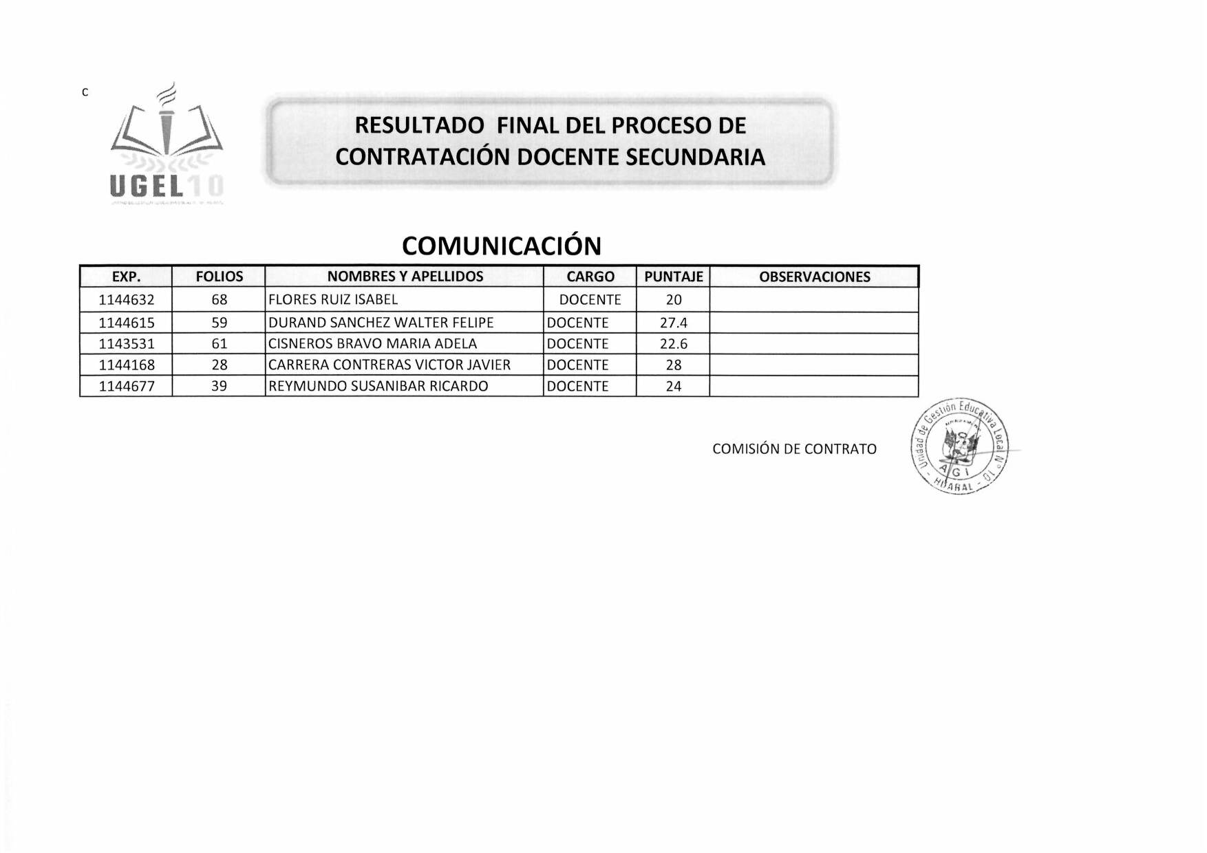 08 Jul,2019 Convocatorias COMMENTS RESULTADO FINAL DEL PROCESO DE CONTRATACIÓN DOCENTE SECUNDARIA - COMUNICACIÓN