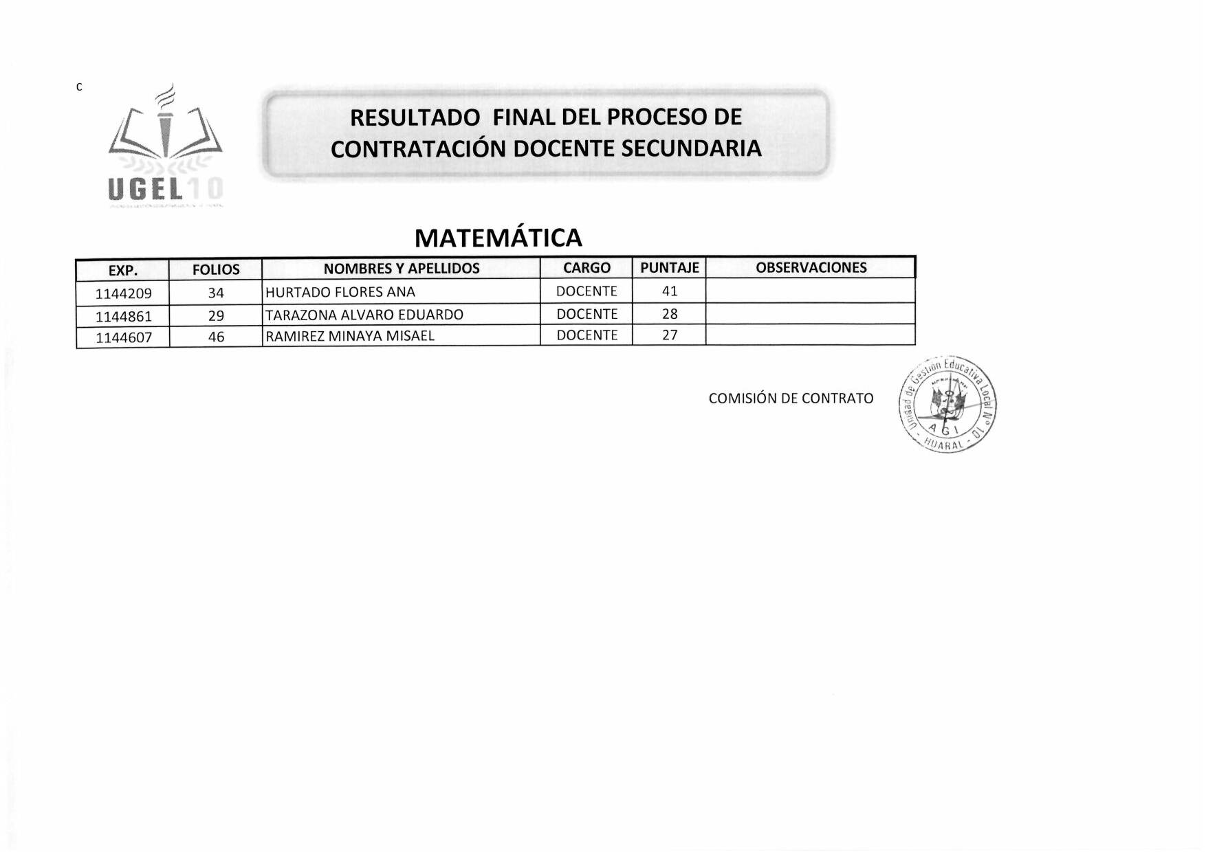 08 Jul,2019 Convocatorias COMMENTS RESULTADO FINAL DEL PROCESO DE CONTRATACIÓN DOCENTE SECUNDARIA - MATEMÁTICA