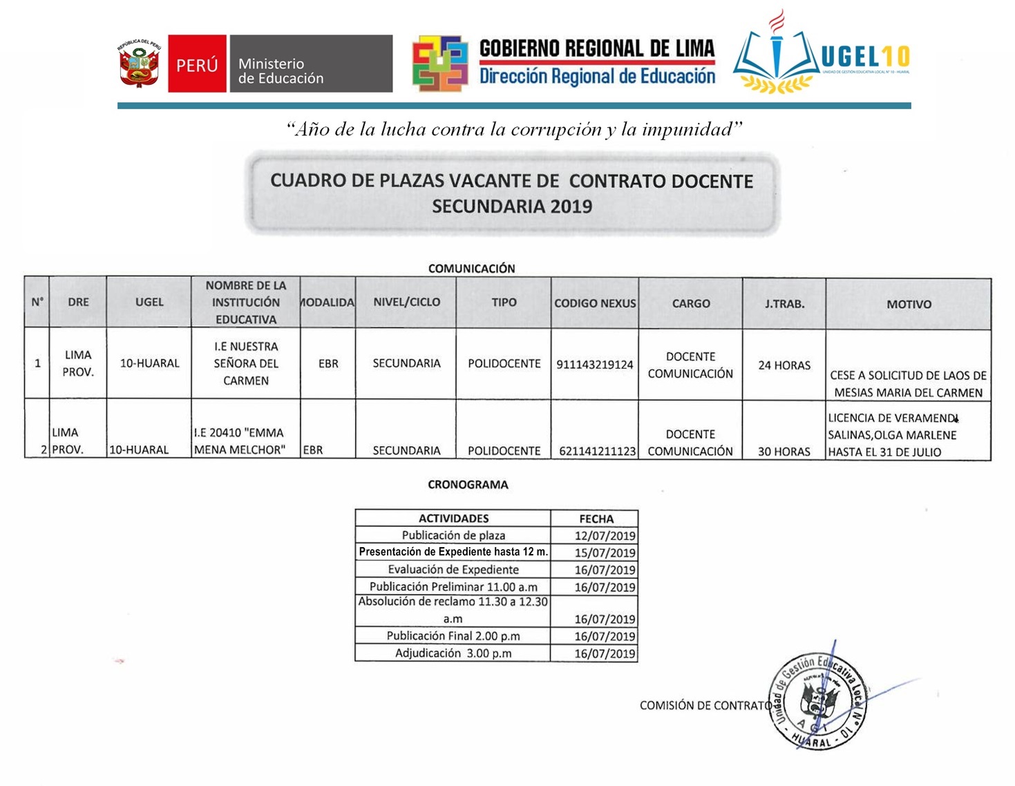 12 Jul,2019 Convocatorias COMMENTS Convocatoria de Plazas Vacantes de Contrato Docente Secundaria [Comunicación]
