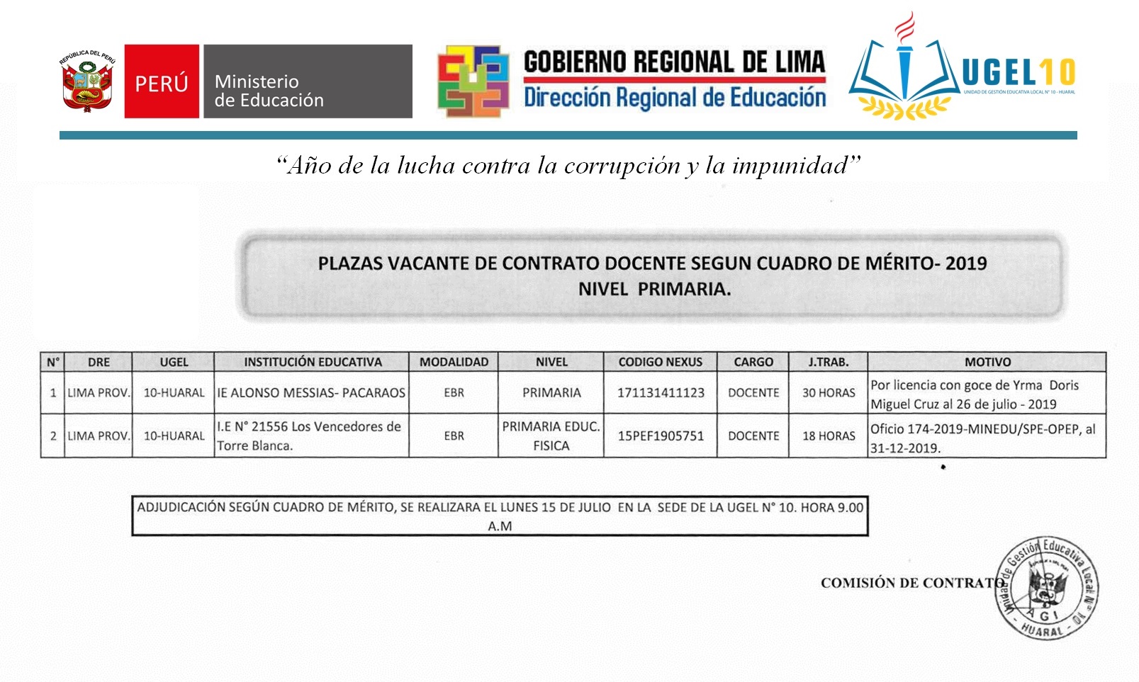 12 Jul,2019 Convocatorias COMMENTS Plaza Vacante de Contrato Docente Según Cuadro de Mérito - Nivel Primaria.