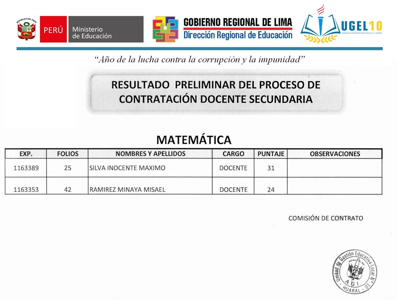 19 Jul,2019 Convocatorias COMMENTS Resultado Preliminar del Proceso de Contratación Docente Secundaria [matemática]