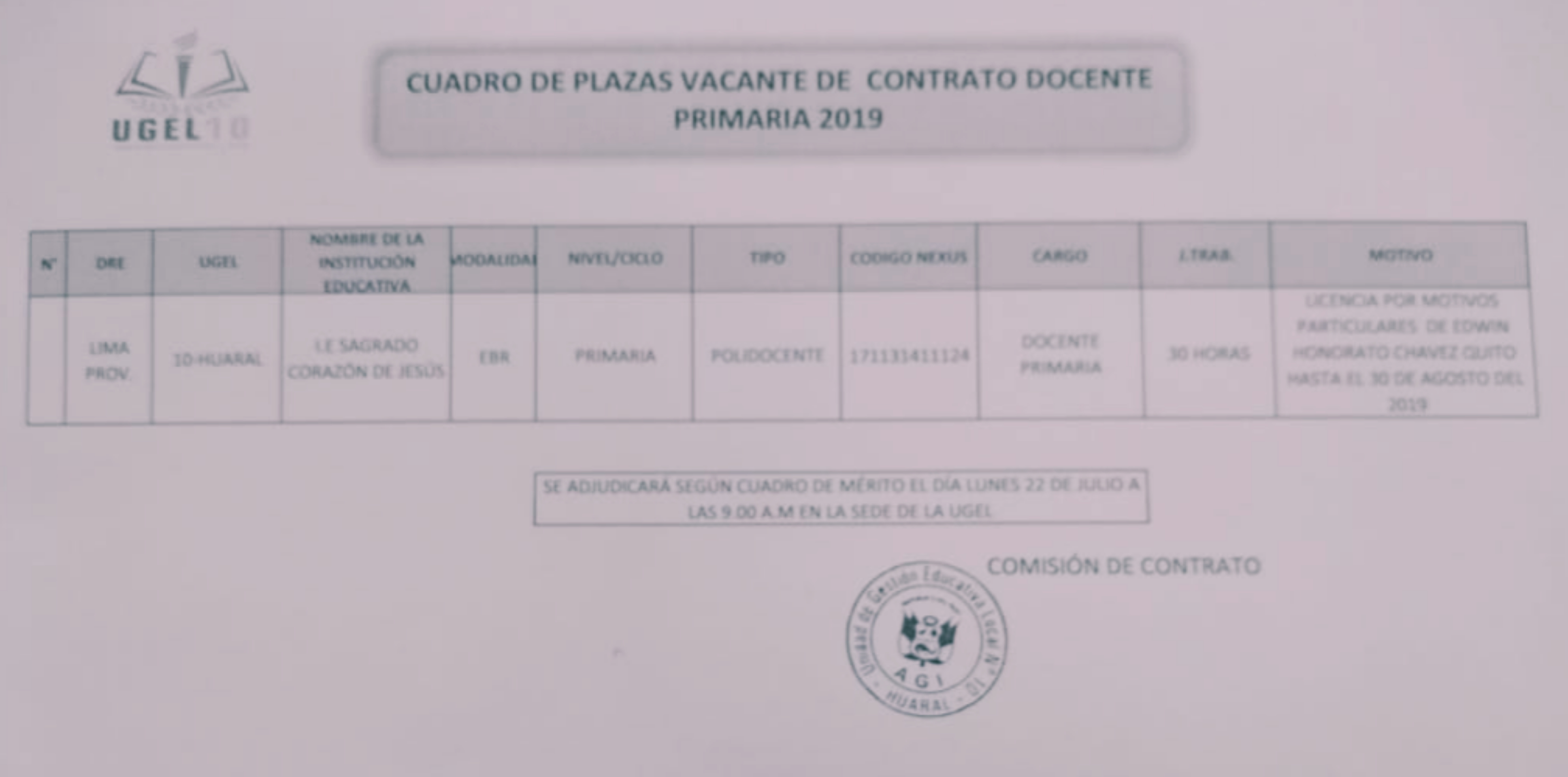 19 Jul,2019 Convocatorias COMMENTS Plaza Vacante de Contrato Docente de Nivel Primaria Según Cuadro de Mérito.
