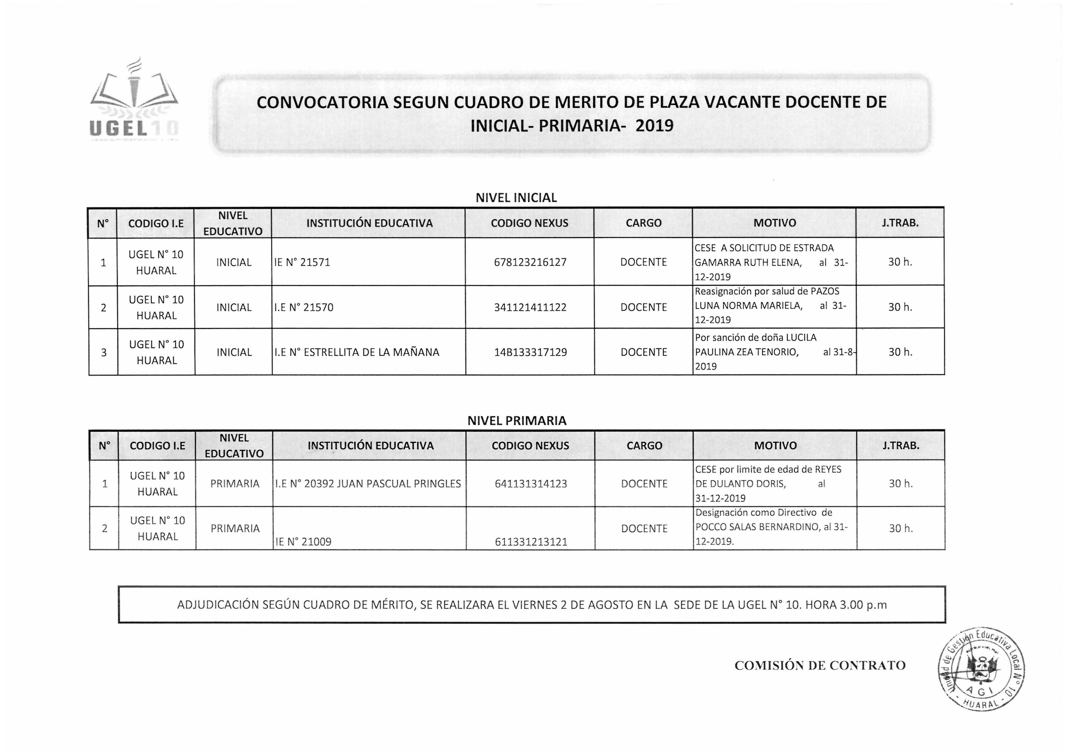 01 Ago,2019 Convocatorias COMMENTS CONVOCATORIA SEGÚN CUADRO DE MERITO DE PLAZA VACANTE DOCENTE DE INICIAL- PRIMARIA - 2019