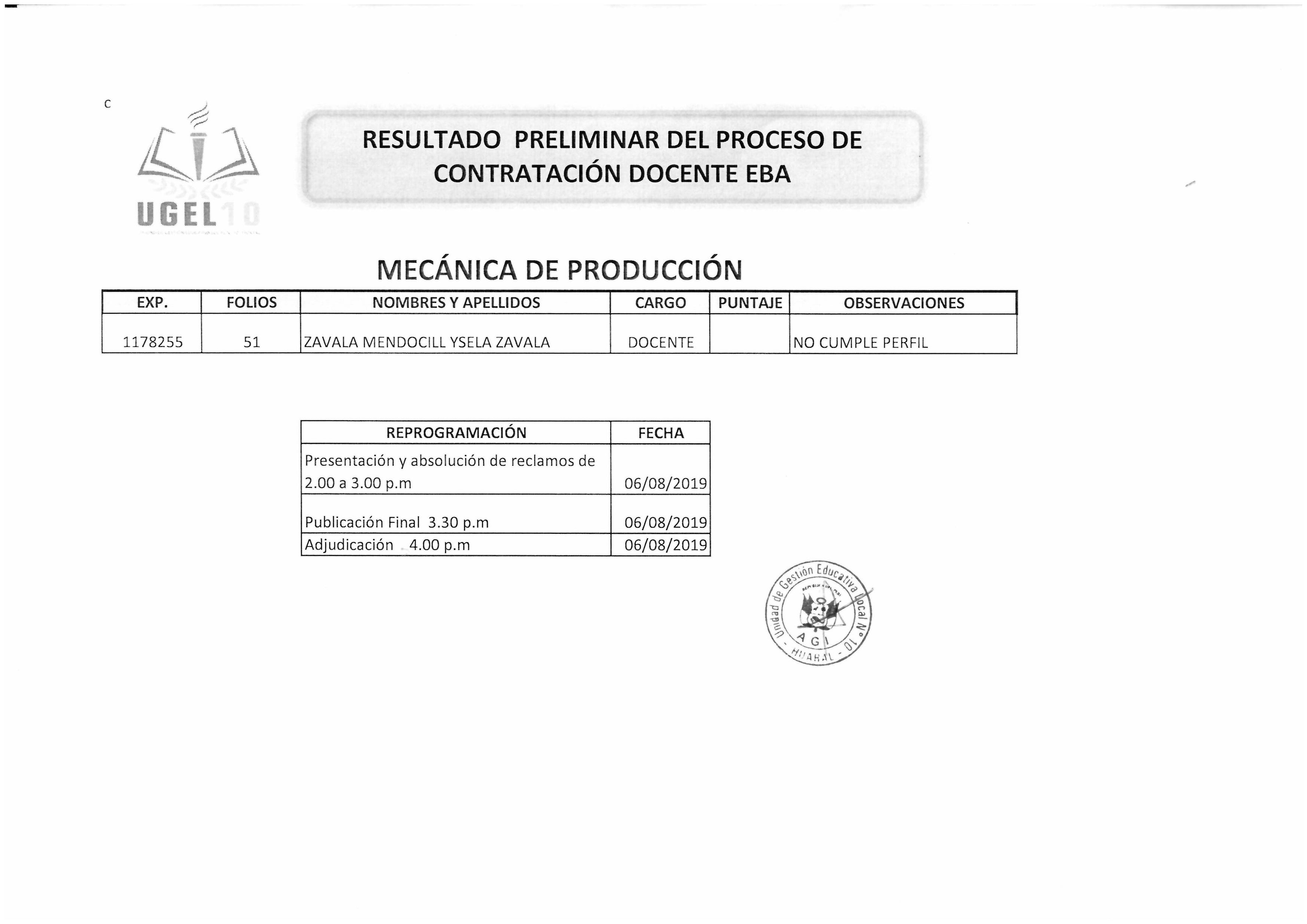 06 Ago,2019 Convocatorias COMMENTS RESULTADO PRELIMINAR DEL PROCESO DE CONTRATACIÓN DOCENTE EBA "MECÁNICA PRODUCCIÓN"