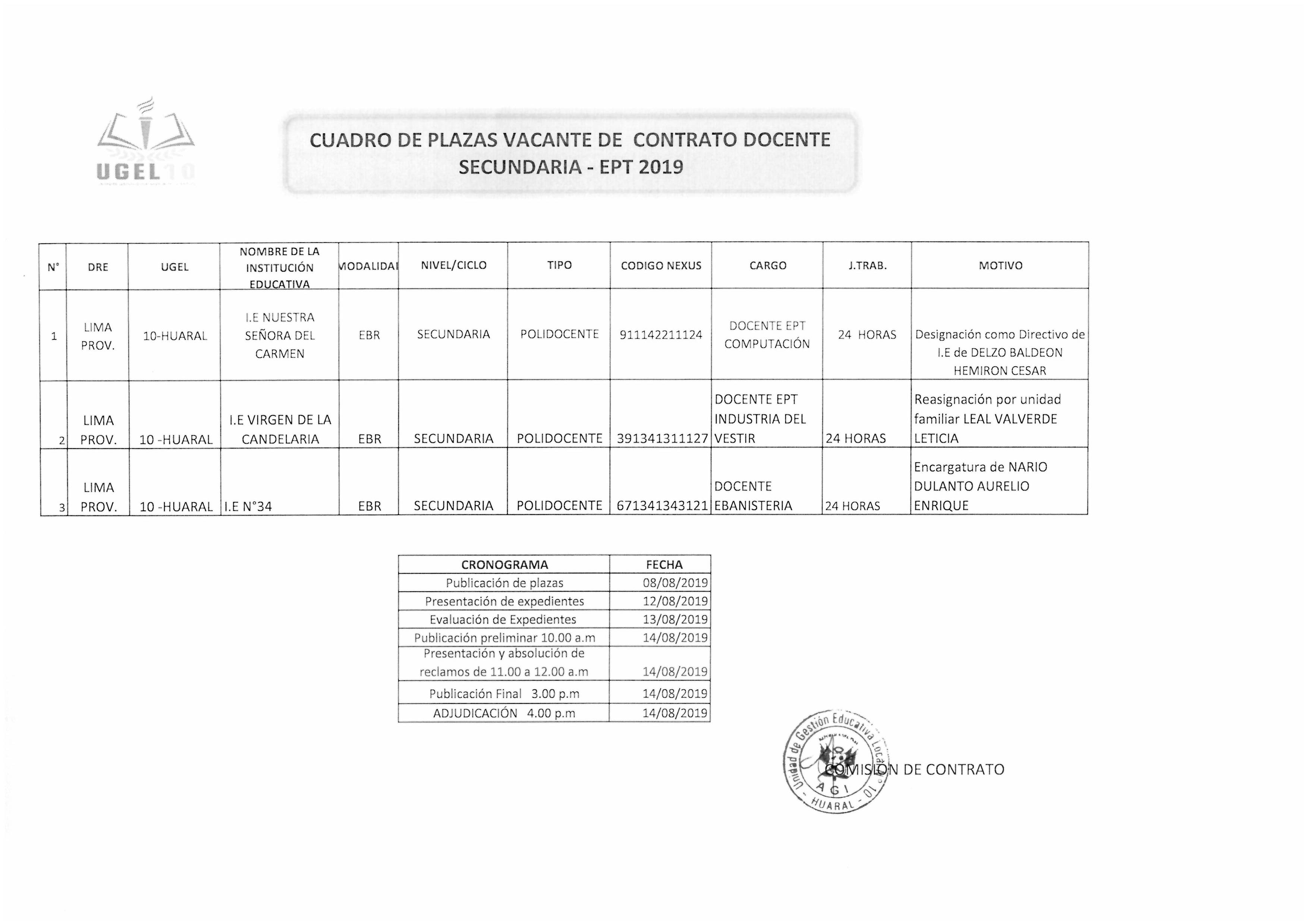 08 Ago,2019 Convocatorias COMMENTS CUADRO DE PLAZAS VACANTE DE CONTRATO DOCENTE SECUNDARIA - EPT 2019
