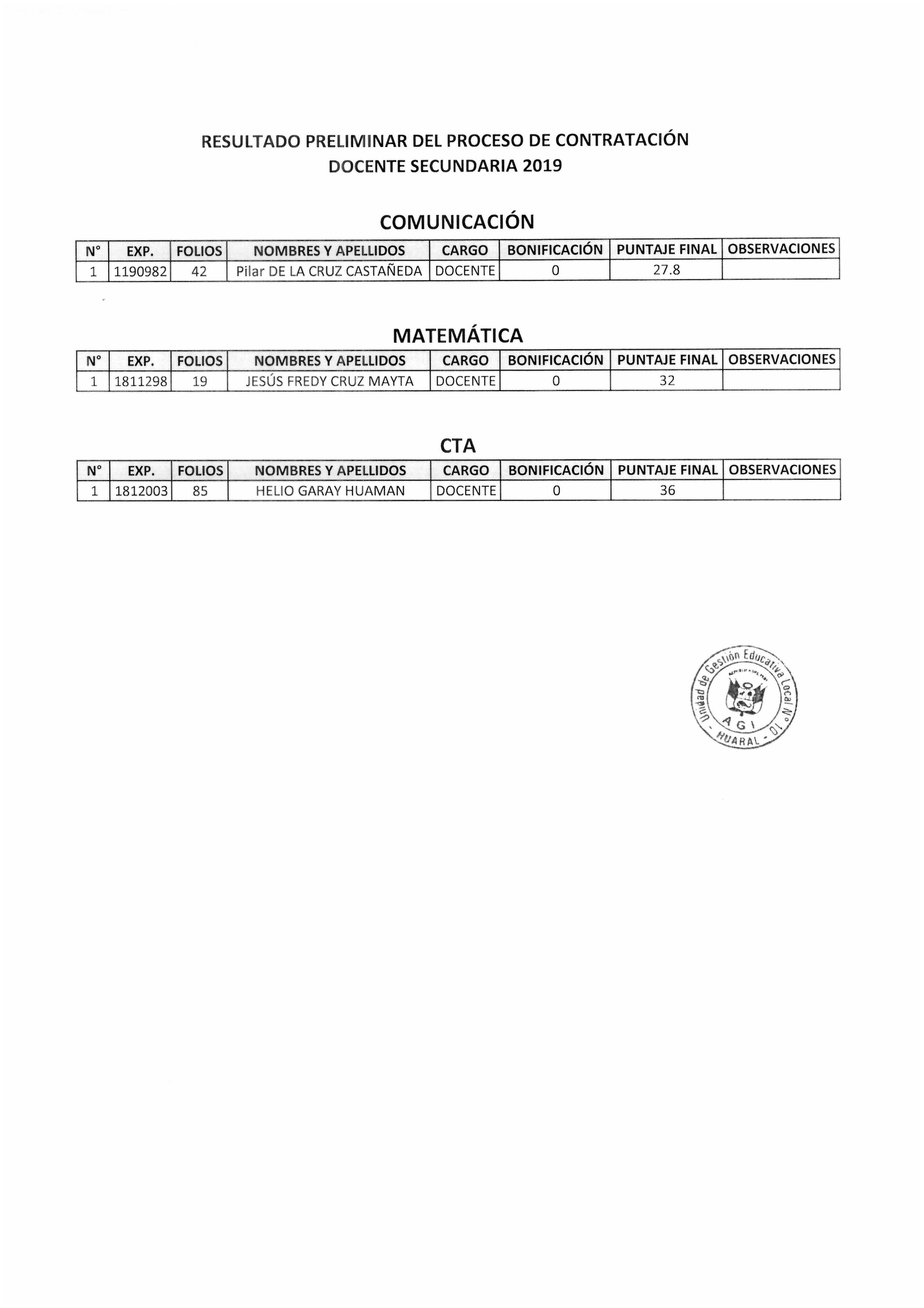 14 Ago,2019 Convocatorias COMMENTS RESULTADO PRELIMINAR DEL PROCESO DE CONTRATACION DOCENTE SECUNDARIA 2019
