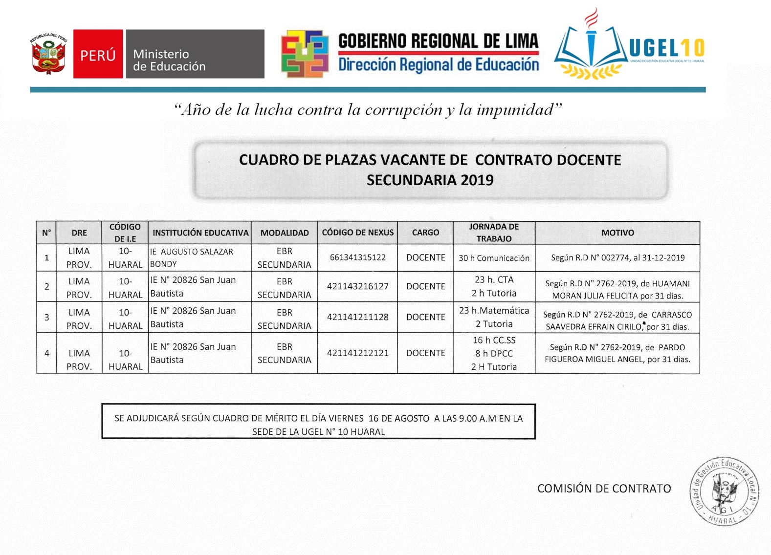 15 Ago,2019 Convocatorias COMMENTS Cuadro de Plazas Vacante de Contrato Docente Secundaria Docente Según Cuadro de Mérito Según Cuadro de Mérito