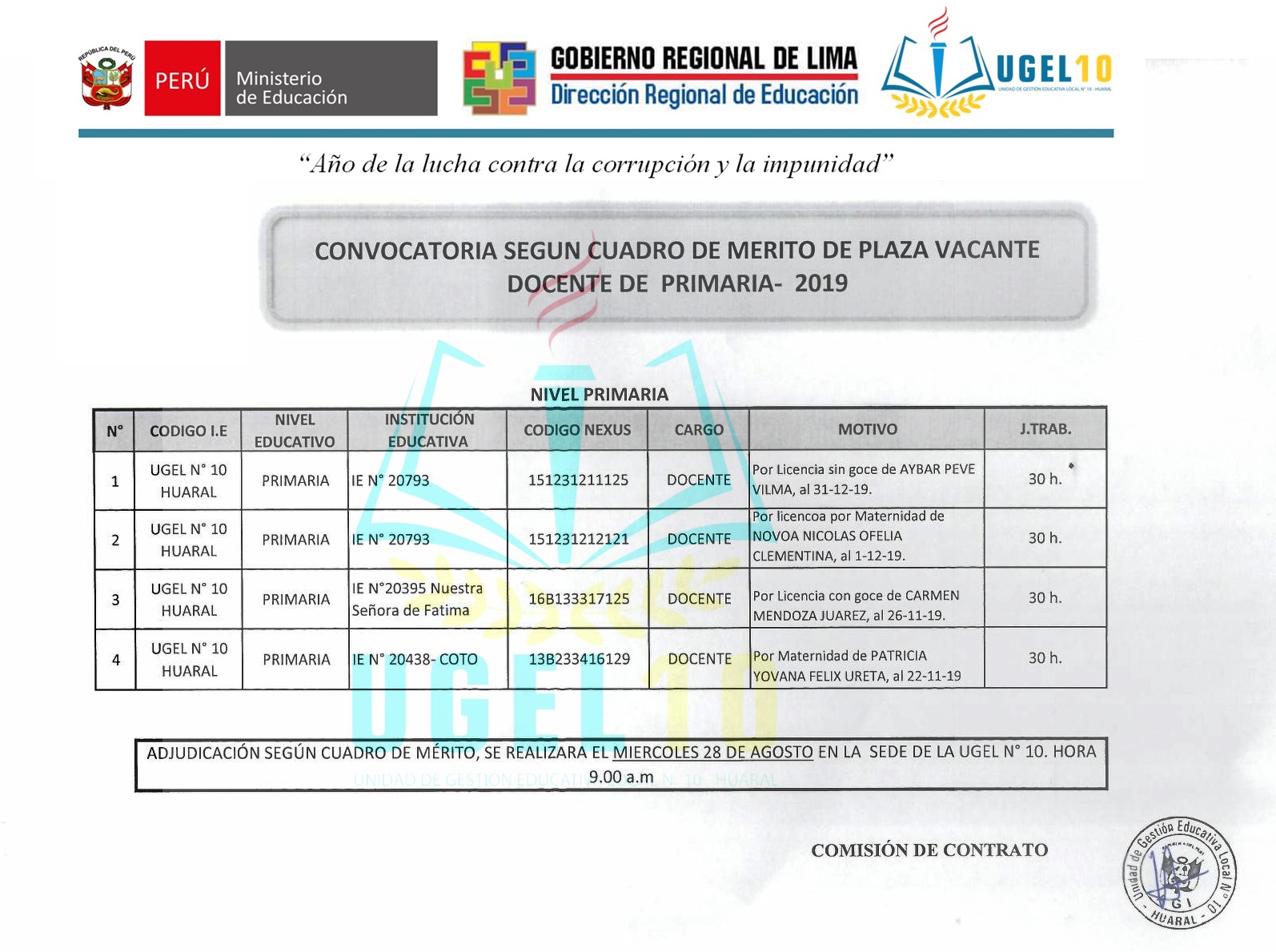 27 Ago,2019 Convocatorias COMMENTS Convocatoria Según Cuadro de Mérito de Plaza Vacante Docente de Primaria 2019