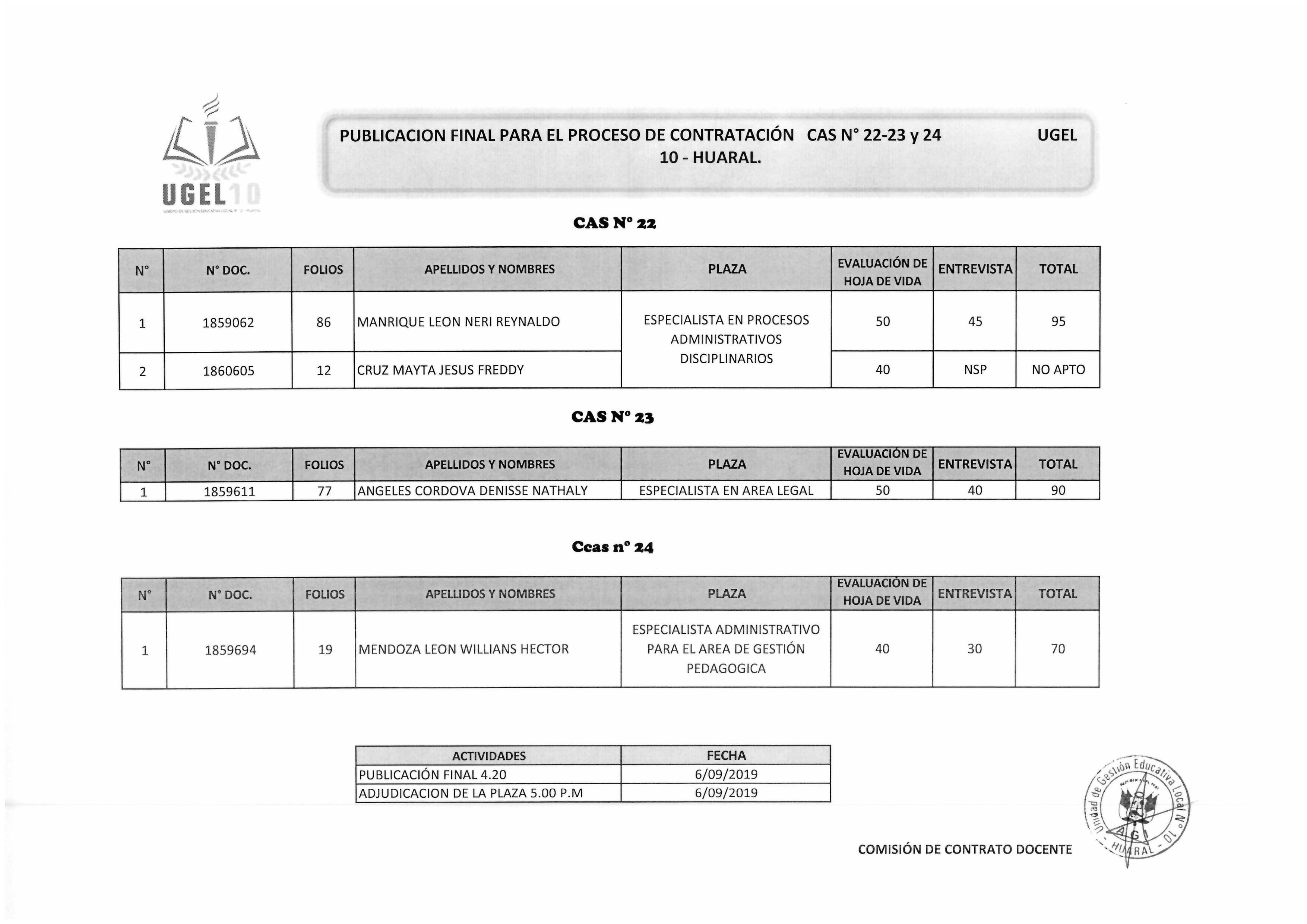 06 Sep,2019 Convocatorias COMMENTS PUBLICACIÓN FINAL PARA EL PROCESO DE CONTRATACIÓN CAS N°22-23 Y 24