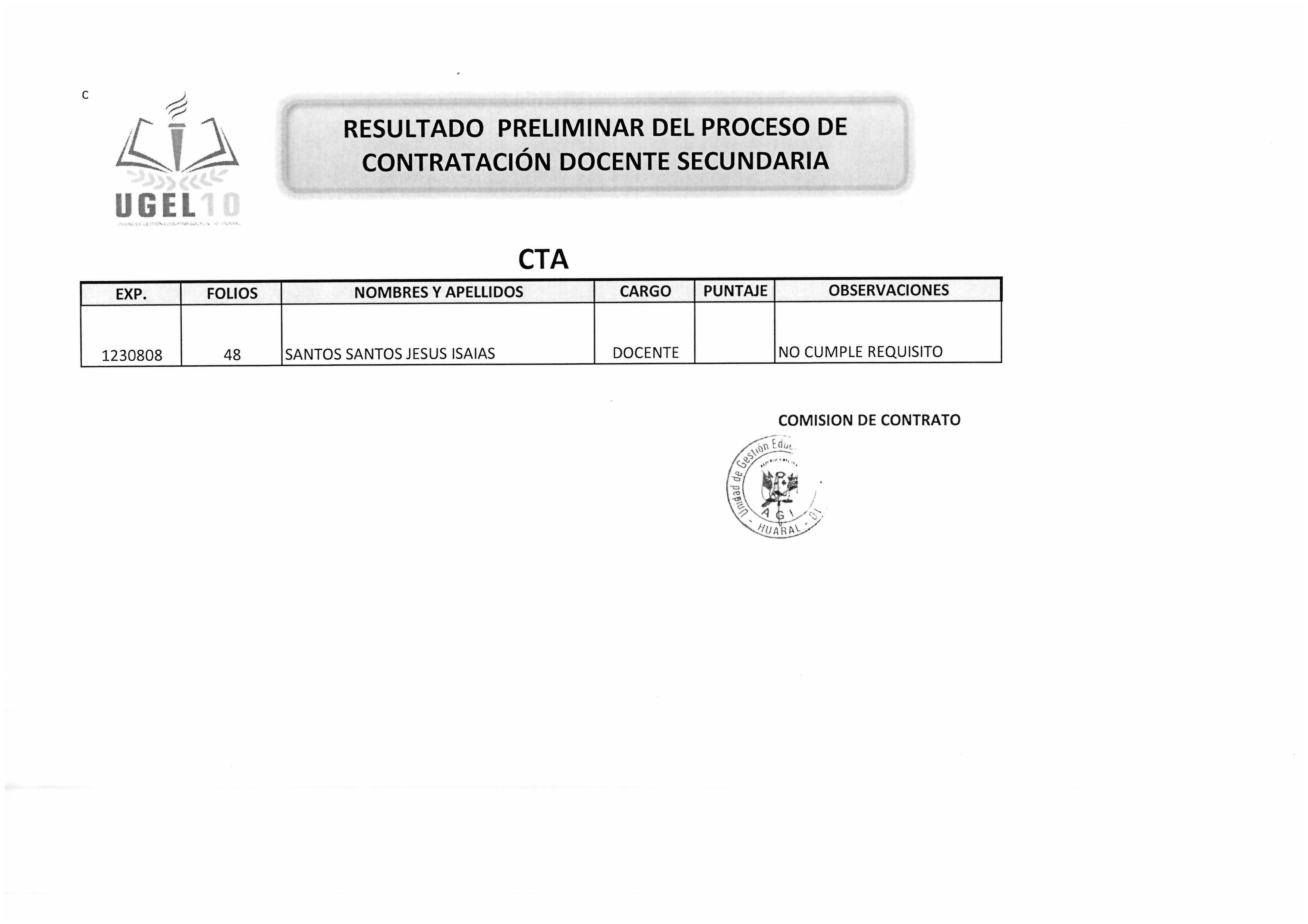 13 Sep,2019 Convocatorias COMMENTS RESULTADO PRELIMINAR DEL PROCESO DE CONTRATACIÓN DOCENTE SECUNDARIA - CTA