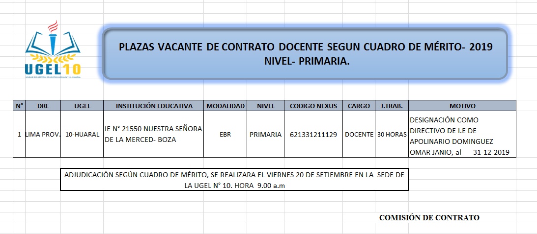 19 Sep,2019 Convocatorias COMMENTS Plaza Vacante de Contrato Docente Según Cuadro de Mérito (nivel primaria).