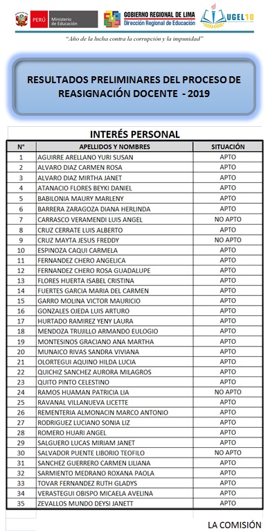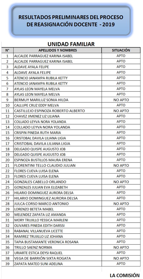 24 Oct,2019 Convocatorias COMMENTS Resultado Preliminar del Proceso de Reasignación Docente 2019 [Interés Personal - Unidad Familiar]