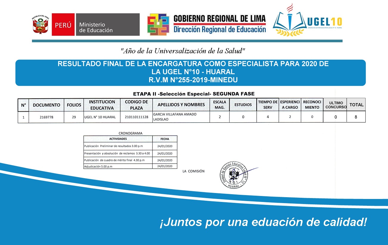 24 Ene,2020 Convocatorias COMMENTS Resultado Final de la Encargatura Como Especialista Para 2020 de la UGEL N° 10.