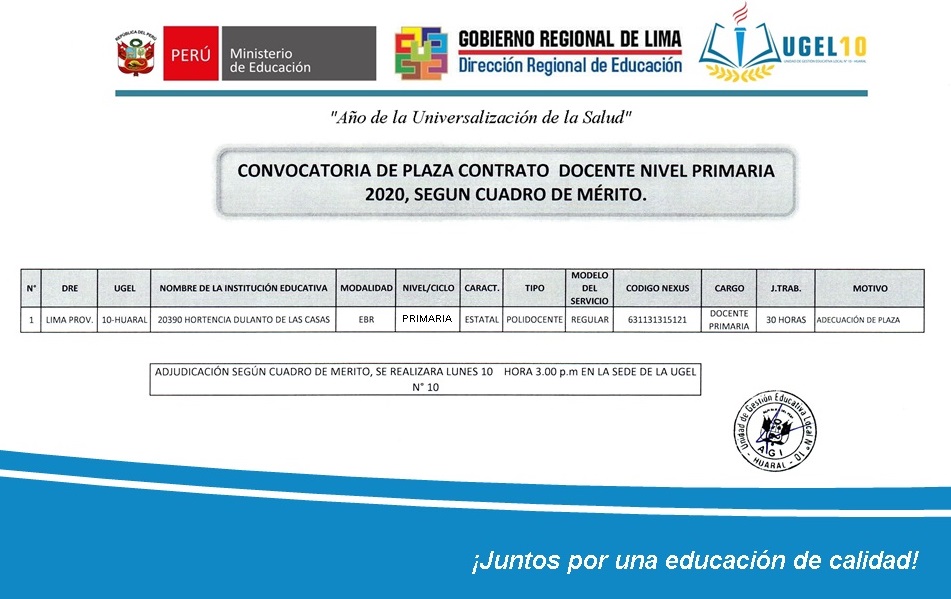 10 Feb,2020 Convocatorias COMMENTS Convocatoria de Plaza Contrato Docente 2020 - Nivel Primaria (según cuadro de mérito)