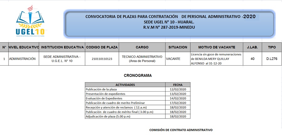 12 Feb,2020 Convocatorias COMMENTS Convocatoria de Plaza para Contratación de Personal Administrativo
