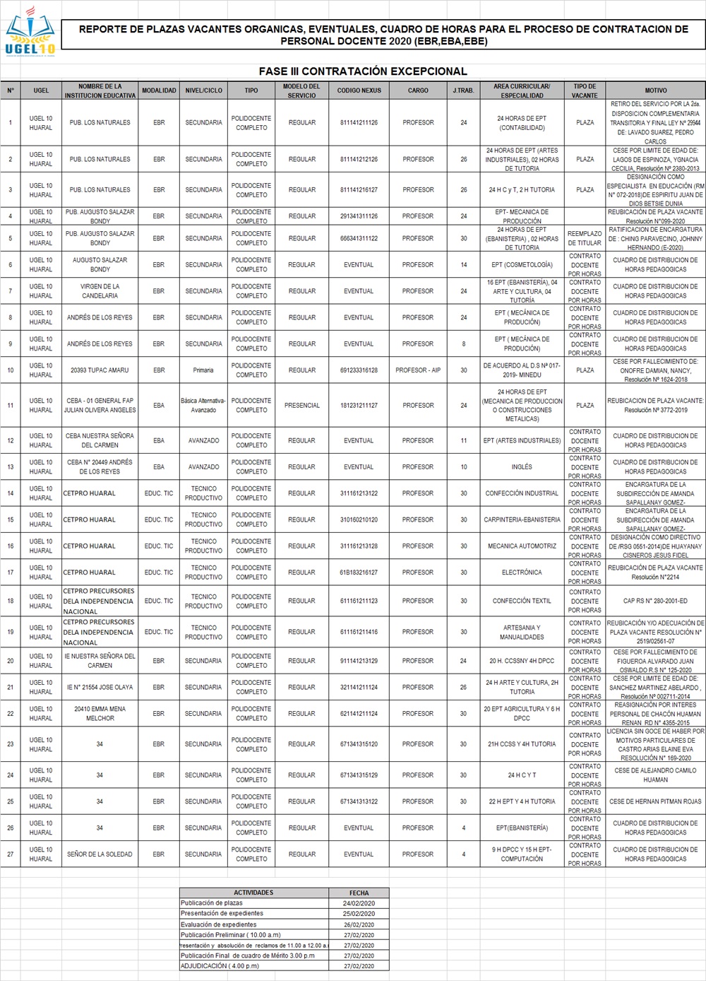24 Feb,2020 Convocatorias COMMENTS Reporte de Plazas Vacantes Orgánicas, Eventuales, Cuadro de Horas Para el Proceso de Contratación de Personal Docente 2020 (EBR, EBA, EBE) Fase III