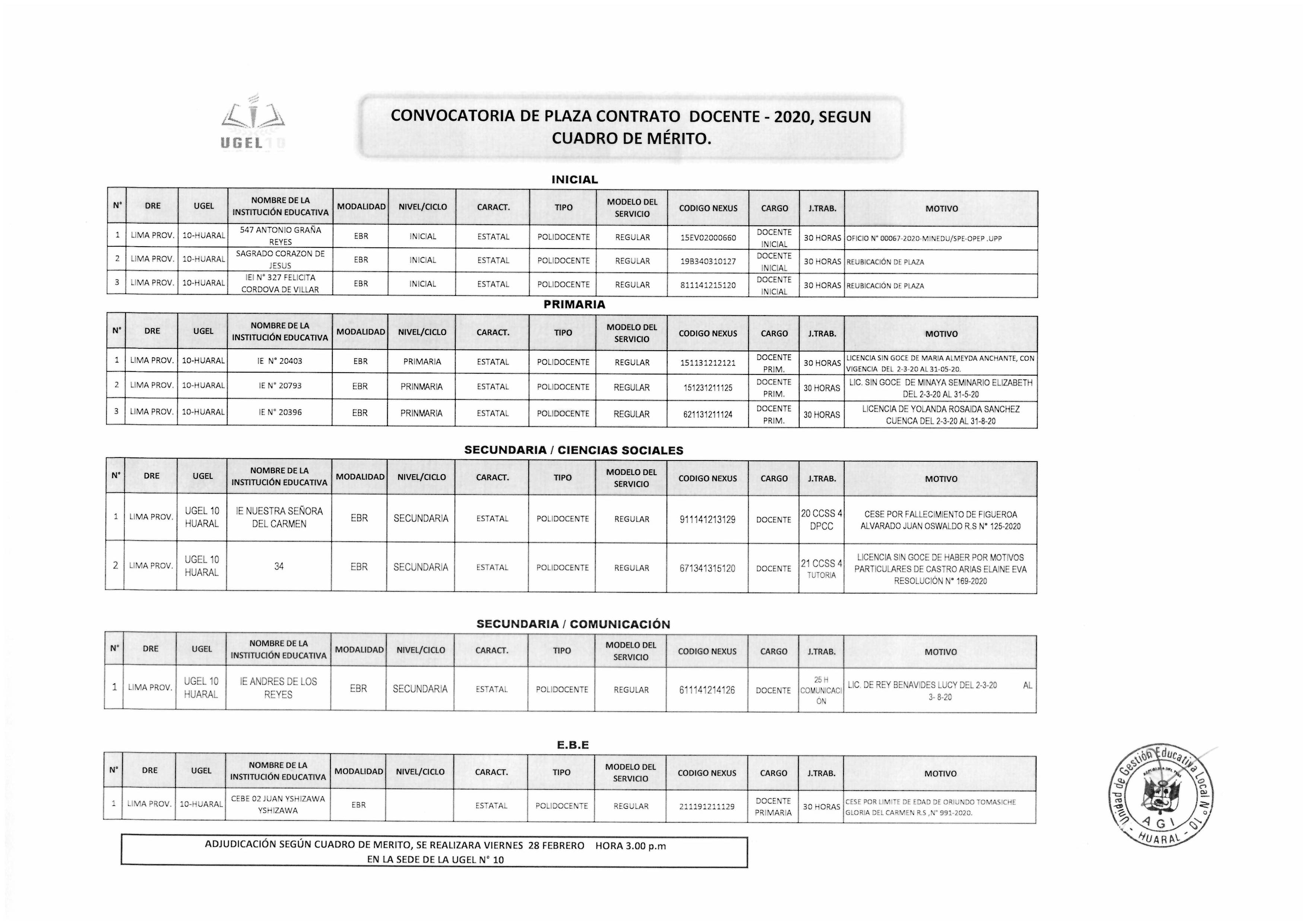 28 Feb,2020 Convocatorias COMMENTS CONVOCATORIA DE PLAZA CONTRATO DOCENTE - 2020 SEGÚN CUADRO DE MERITO