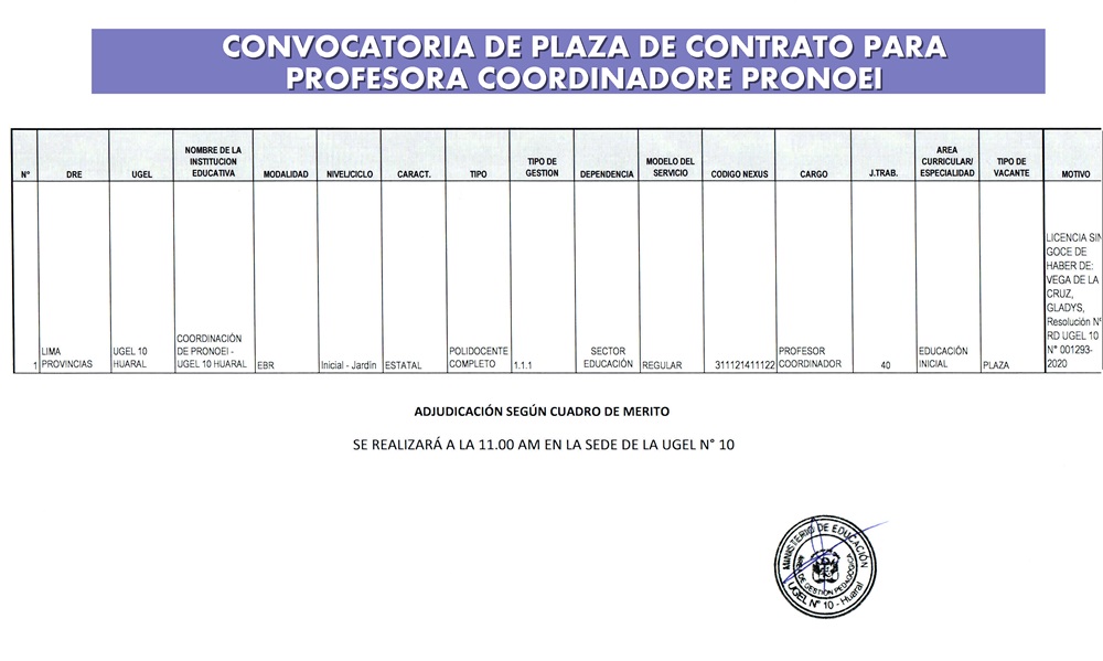 05 Mar,2020 Convocatorias COMMENTS Convocatoria de Plaza de Contrato para Profesora Coordinara PRONOEI 2020 Según cuadro de mérito Adjudicación viernes 05 de marzo a las 11 a.m. en la sede de la Ugel 10