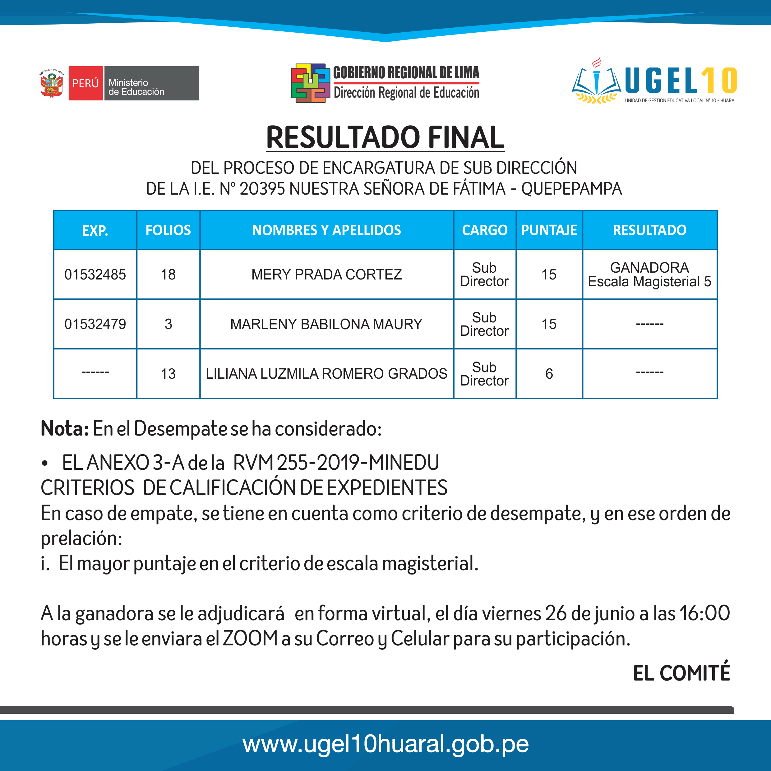 25 Jun,2020 Convocatorias COMMENTS RESULTADO FINAL DEL PROCESO DE ENCARGATURA DE SUB DIRECCIÓN DE LA I.E. Nº 20395 NUESTRA SEÑORA DE FÁTIMA - QUEPEPAMPA