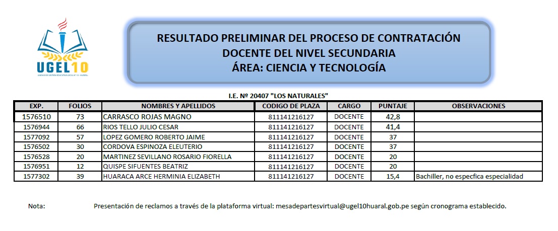 26 Ago,2020 Convocatorias COMMENTS RESULTADOS PRELIMINARES NIVEL SECUNDARIA - ÁREA CIENCIA Y TECNOLOGÍA OS PRELIMINARES