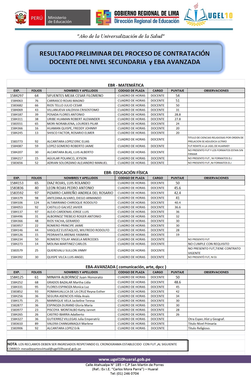 03 Sep,2020 Convocatorias COMMENTS Resultado Preliminar del Proceso de Contratación Docente del Nivel Secundaria y EBA Avanzada