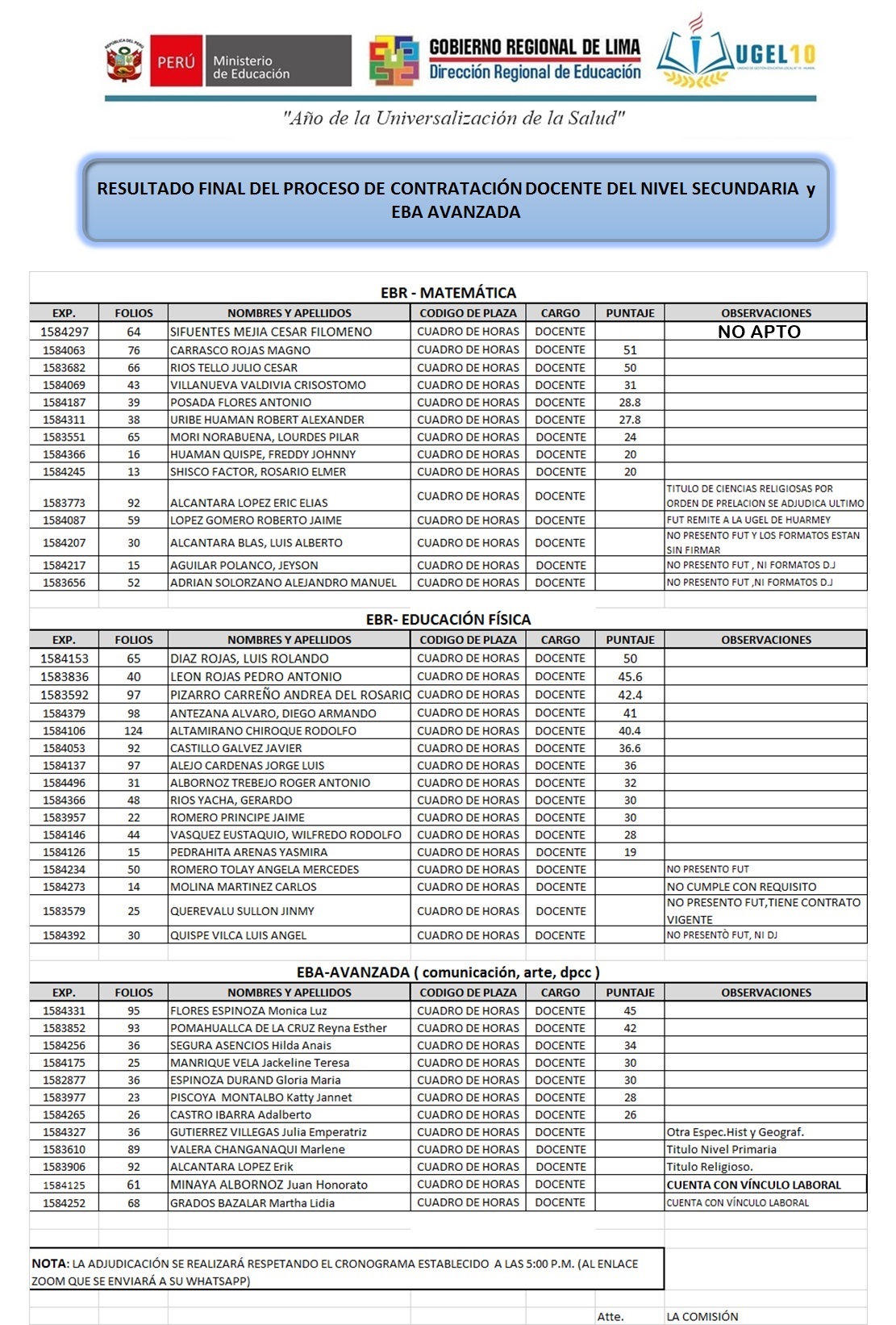 04 Sep,2020 Convocatorias COMMENTS Resultado Final del Proceso de Contratación Docente de Nivel Secundaría y EBA Avanzada.