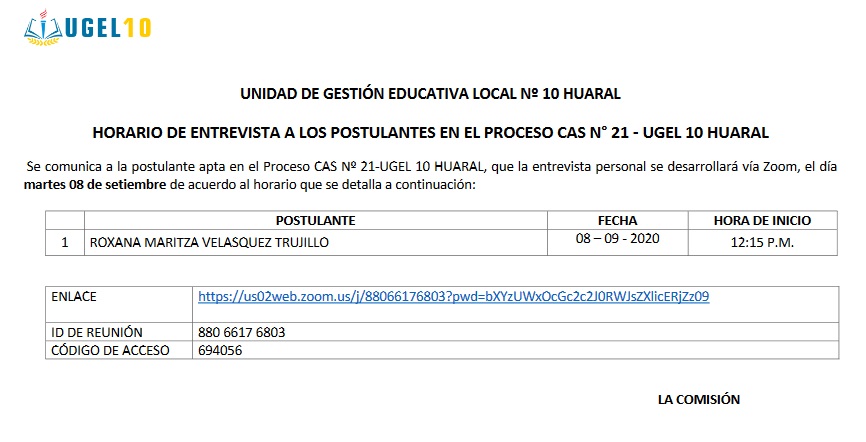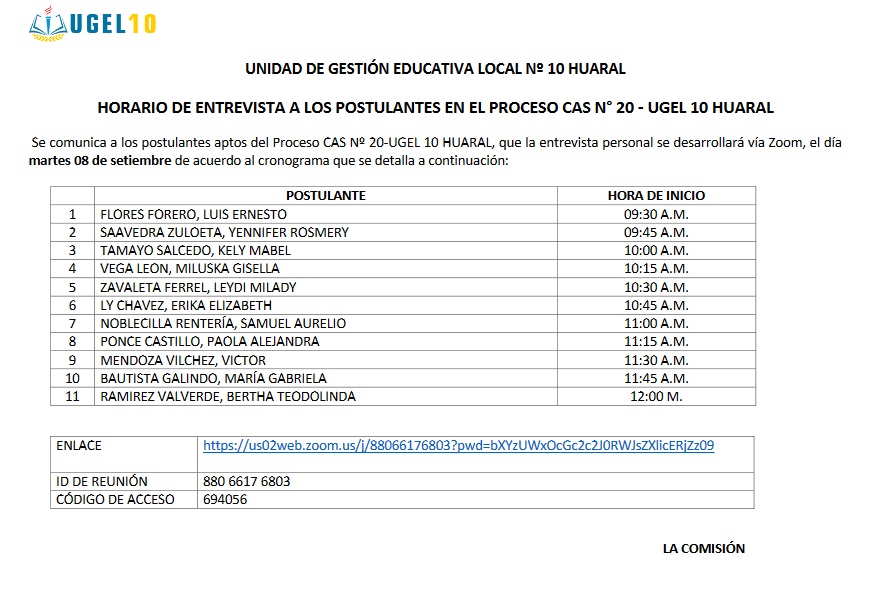 07 Sep,2020 Convocatorias COMMENTS CAS 20 y 21 - Resultados de la Evaluación Curricular. https://us02web.zoom.us/j/88066176803?pwd=bXYzUWxOcGc2c2J0RWJsZXlicERjZz09#success