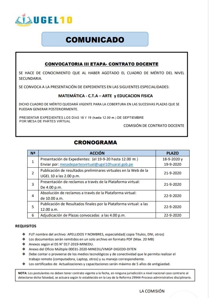 18 Sep,2020 Convocatorias COMMENTS Convocatoria Contrato Docente - III Etapa (nivel secundaria) VER ANEXO (EXPEDIENTE: DITEN2020-INT-0065555Esto es una copia autentica imprimible de un documento electrónicoarchivado del Ministerio de Educación, aplicando lo dispuesto por el Art. 25de D.S. 070-2013-PCM y la Tercera Disposición Complementaria Final delD.S. 026-2016-PCM. Su autenticidad e integridad pueden ser contrastadas através de la siguiente dirección web:http://esinad.minedu.gob.pe/e_sinadmed_1/VDD_ConsultaDocumento.aspx e ingresando la siguiente clave: B62AC6ANEXOORIENTACIONES PARA LA CONTRATACIÓN DOCENTE REGULADA MEDIANTE ELDECRETO SUPREMO Nº 017-2019-MINEDU, EN EL CONTEXTO DE LA PRESTACIÓNDEL SERVICIO NO PRESENCIAL Y EL TRABAJO REMOTO)
