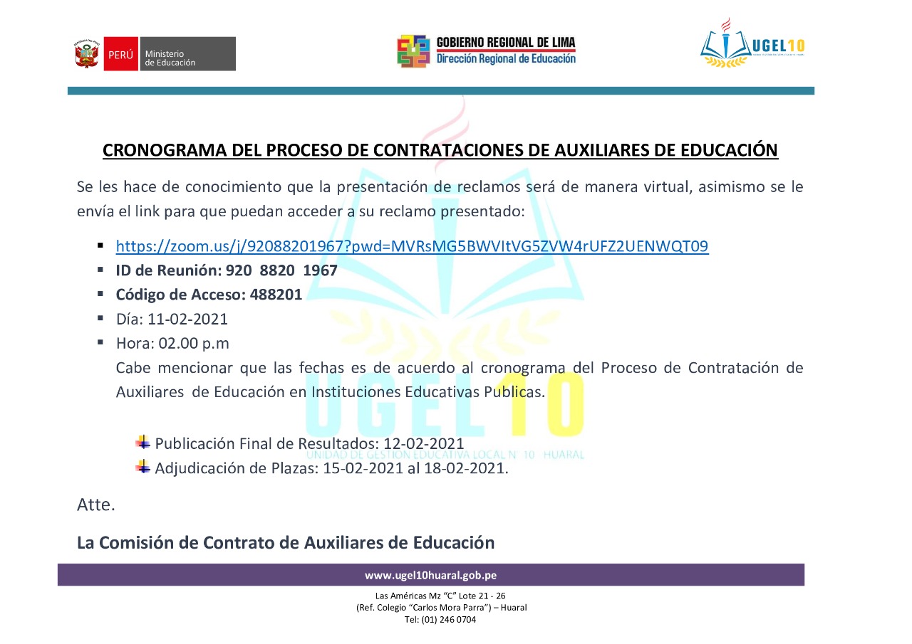 05 Feb,2021 Convocatorias COMMENTS CRONOGRAMA DEL PROCESO DE CONTRATACIONES DE AUXILIARES DE EDUCACIÓN