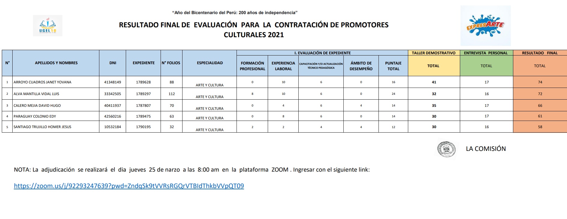 24 Mar,2021 Convocatorias COMMENTS RESULTADO FINAL EVALUACIÓN CONTRATACIÓN DE PROMOTORES INGRESAR ZOOM : https://zoom.us/j/92293247639?pwd=ZndqSk9tVVRsRGQrVTBIdThkbVVpQT09
