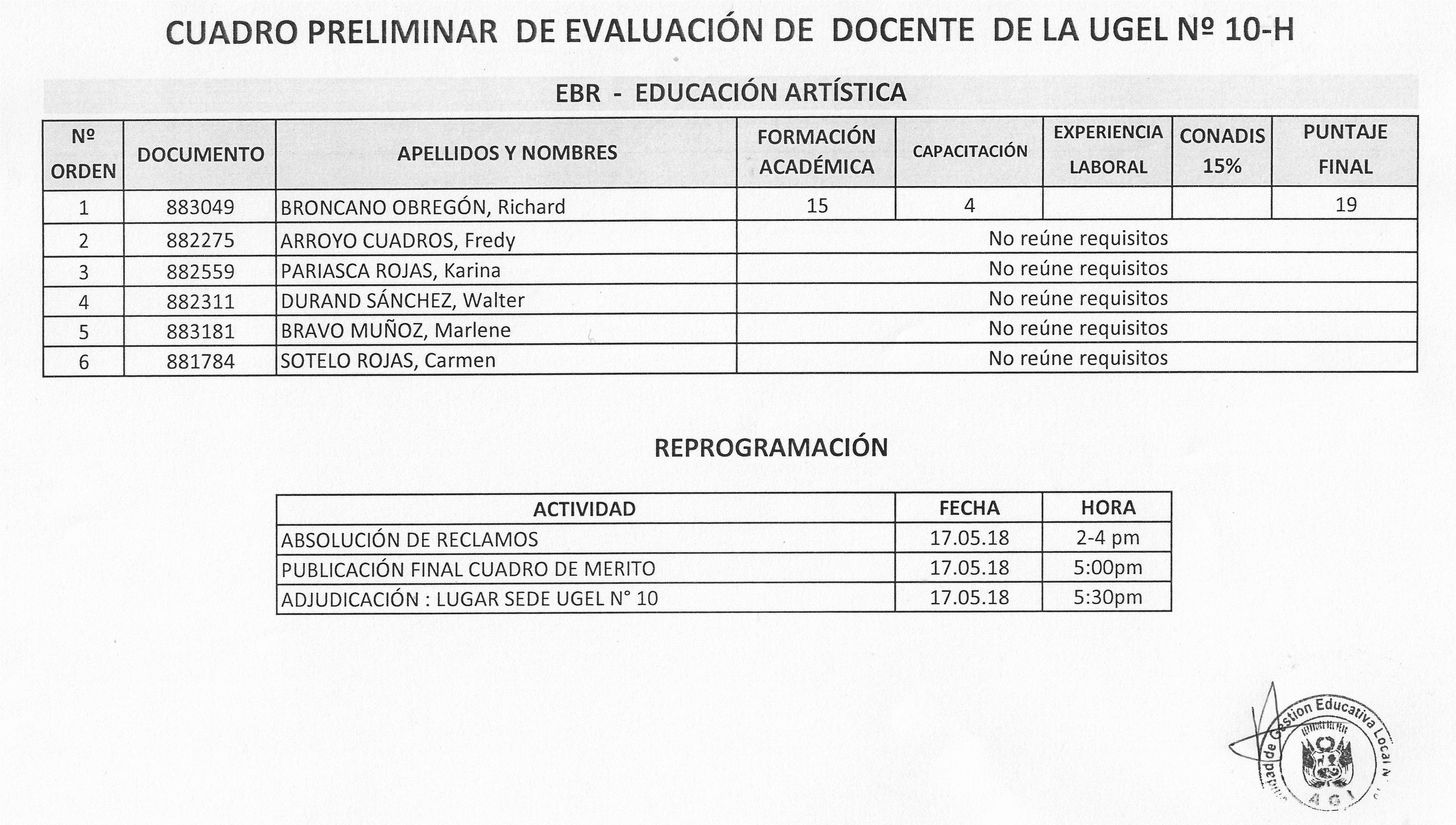 17 May,2018 Convocatorias COMMENTS CUADRO PRELIMINAR DE EVALUACIÓN DE DOCENTE EBR-EDUCACIÓN ARTÍSTICA
