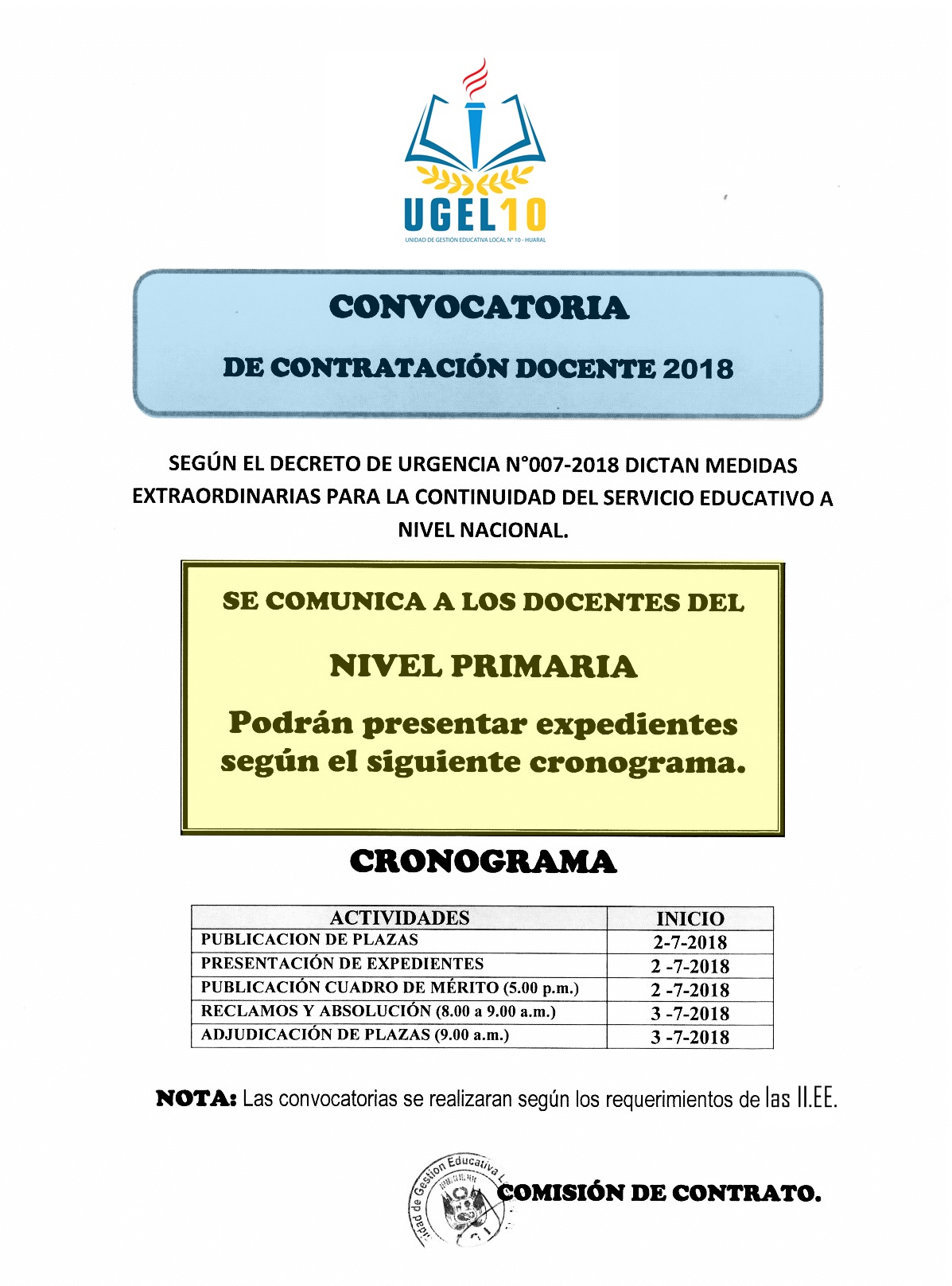 02 Jul,2018 Convocatorias COMMENTS Convocatoria de Contratación Docente del Nivel Primaria [Presentar expedientes según cronograma]