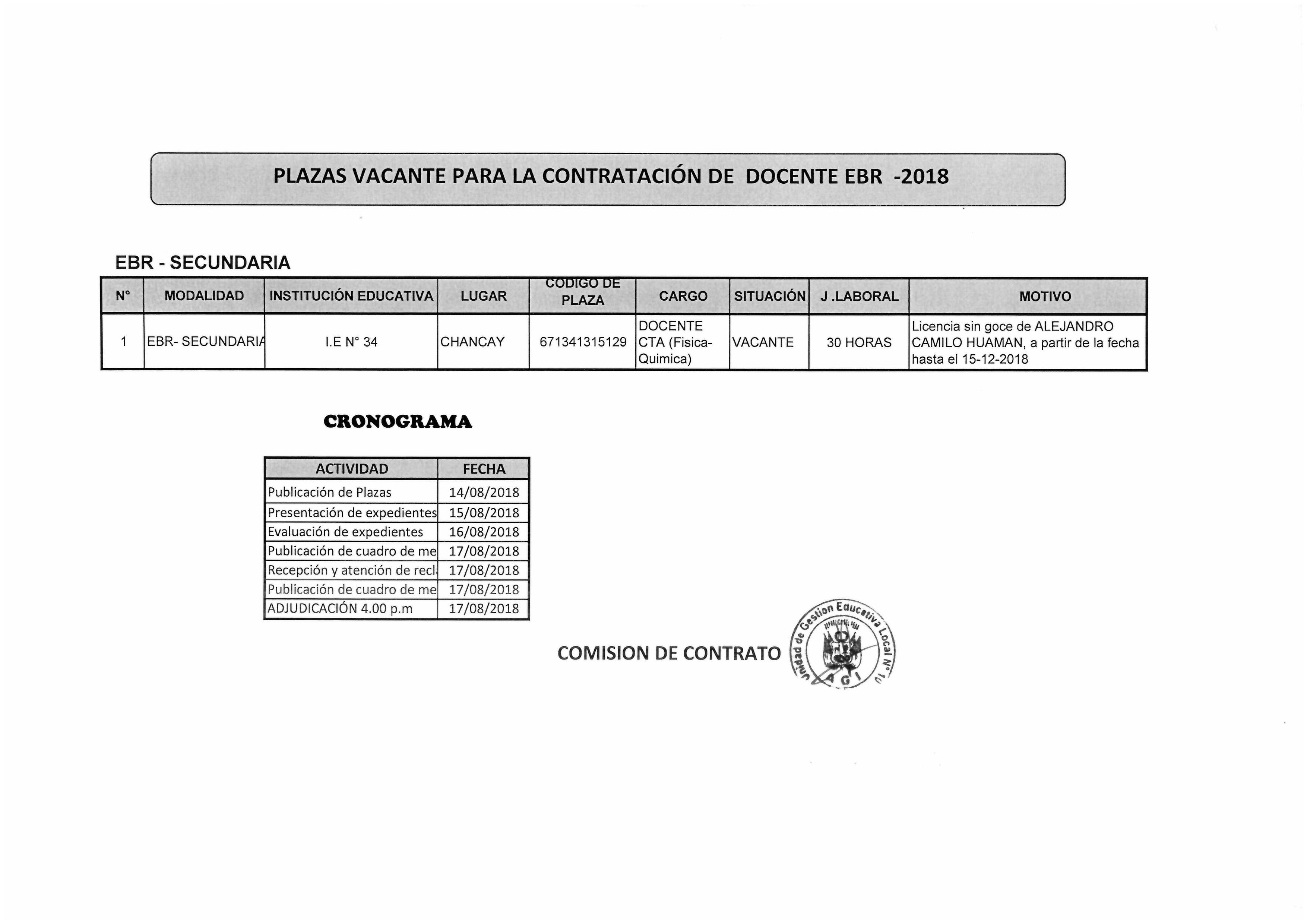 14 Ago,2018 Convocatorias COMMENTS Convocatoria Plaza Vacante para la Contratación de Docente de E.B.R