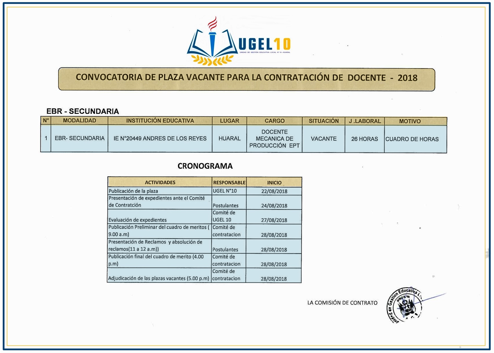 22 Ago,2018 Convocatorias COMMENTS Plaza Vacante para la Contratación de Docente Mecánica de Producción EPT